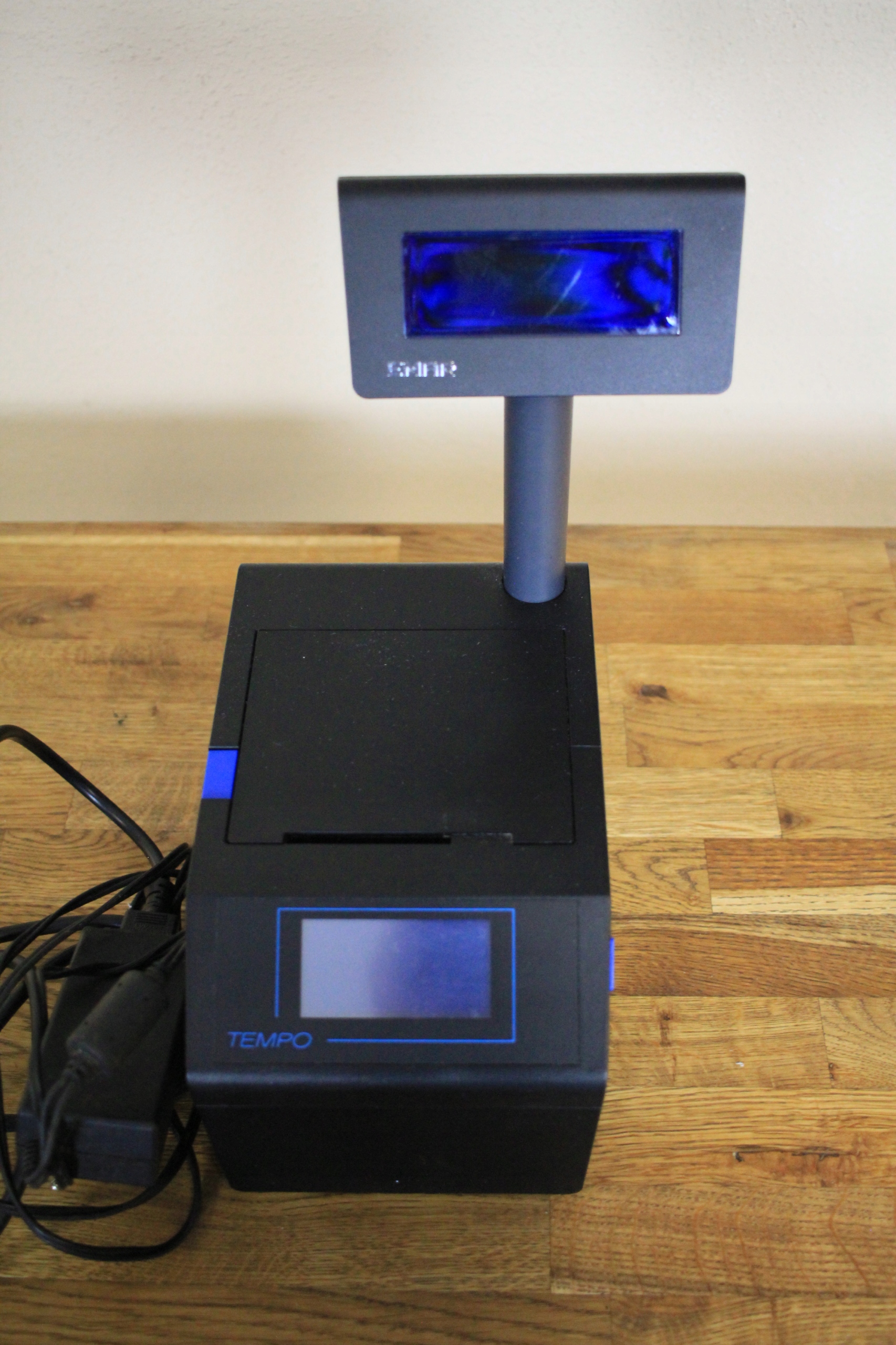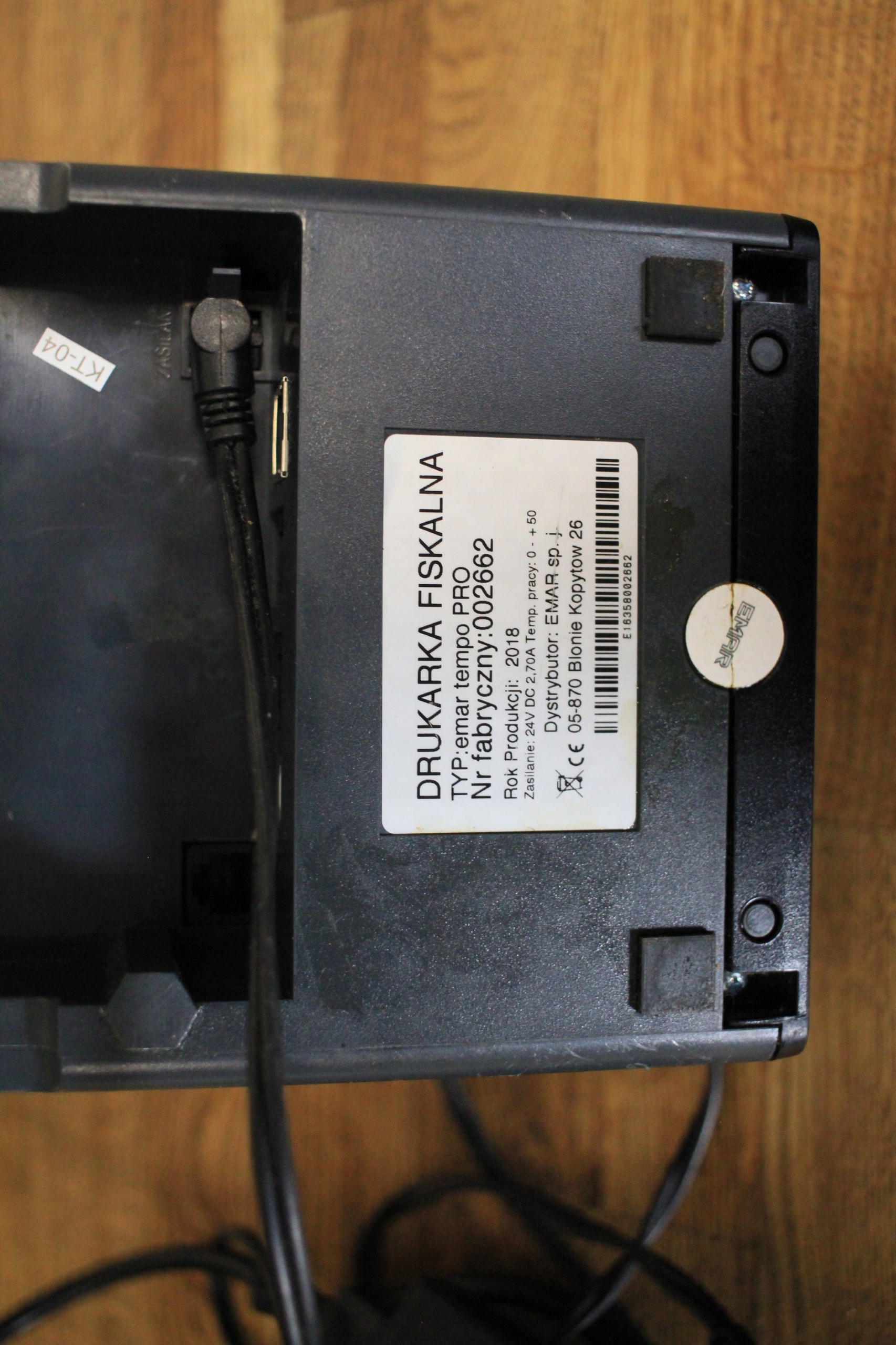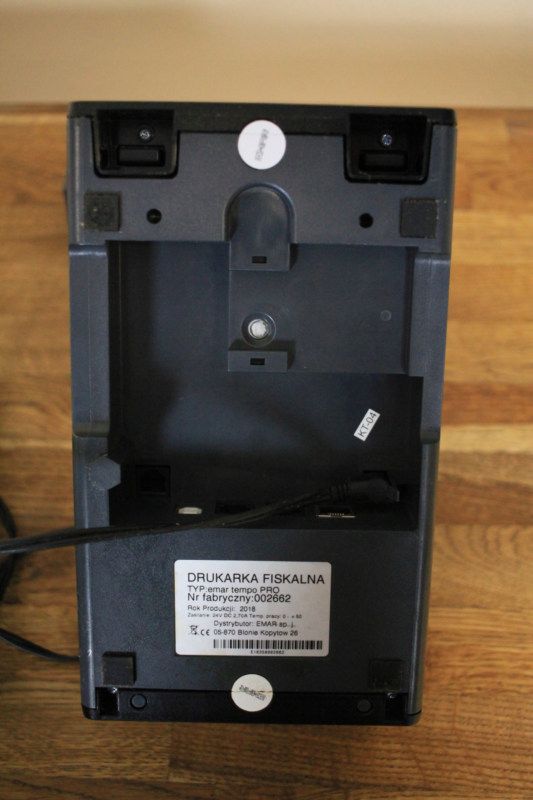Drukarka fiskalna Emar Tempo Pro w kolorze czarnym, używana, w pełni sprawna technicznie (wymaga jedynie wymiany modułu fiskalnego przy dodaniu nowego podatnika). Wyposażona w interfejs Ethernet oraz porty USB i RS232, co umożliwia szybki dostęp do kopii paragonów i pełną zgodność z wymogami Jednolitego Pliku Kontrolnego. Idealna do placówek handlowych, usługowych i gastronomicznych.