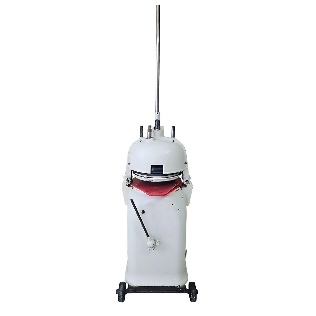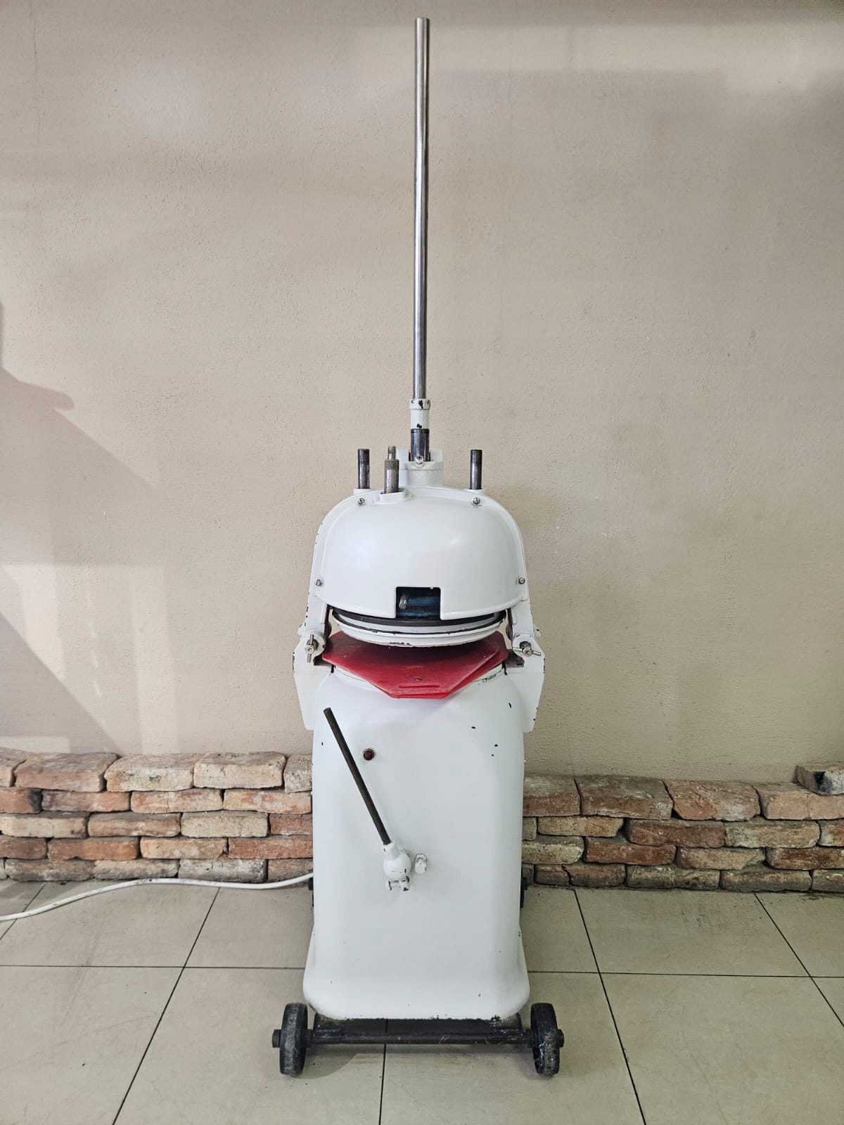 - Wykonanie – konstrukcja stalowa zamontowana na kółkach, dzięki którym znacznie ułatwione jest przestawianie maszyny, a podczas pracy jest stabilna. Dzięki zastosowaniu anodowanej i teflonowej głowicy prasującej każda bułka ma idealny i powtarzalny kształt dodatkowo pierścień zapobiegają przylepianiu się ciasta.