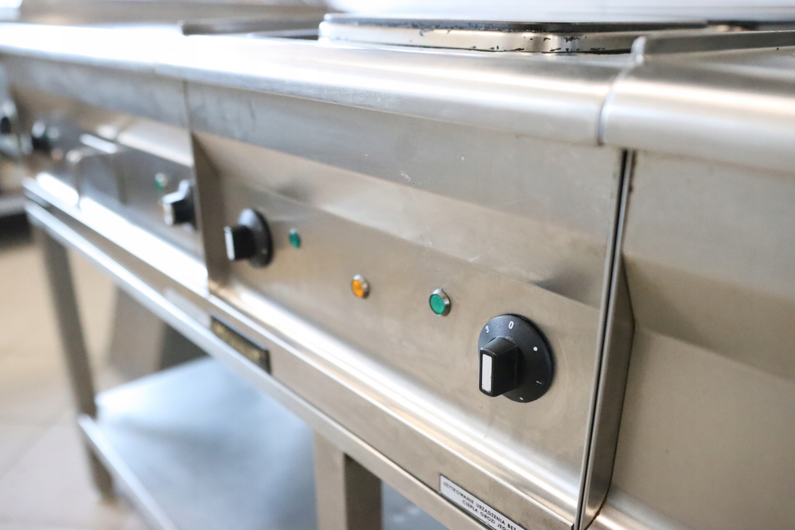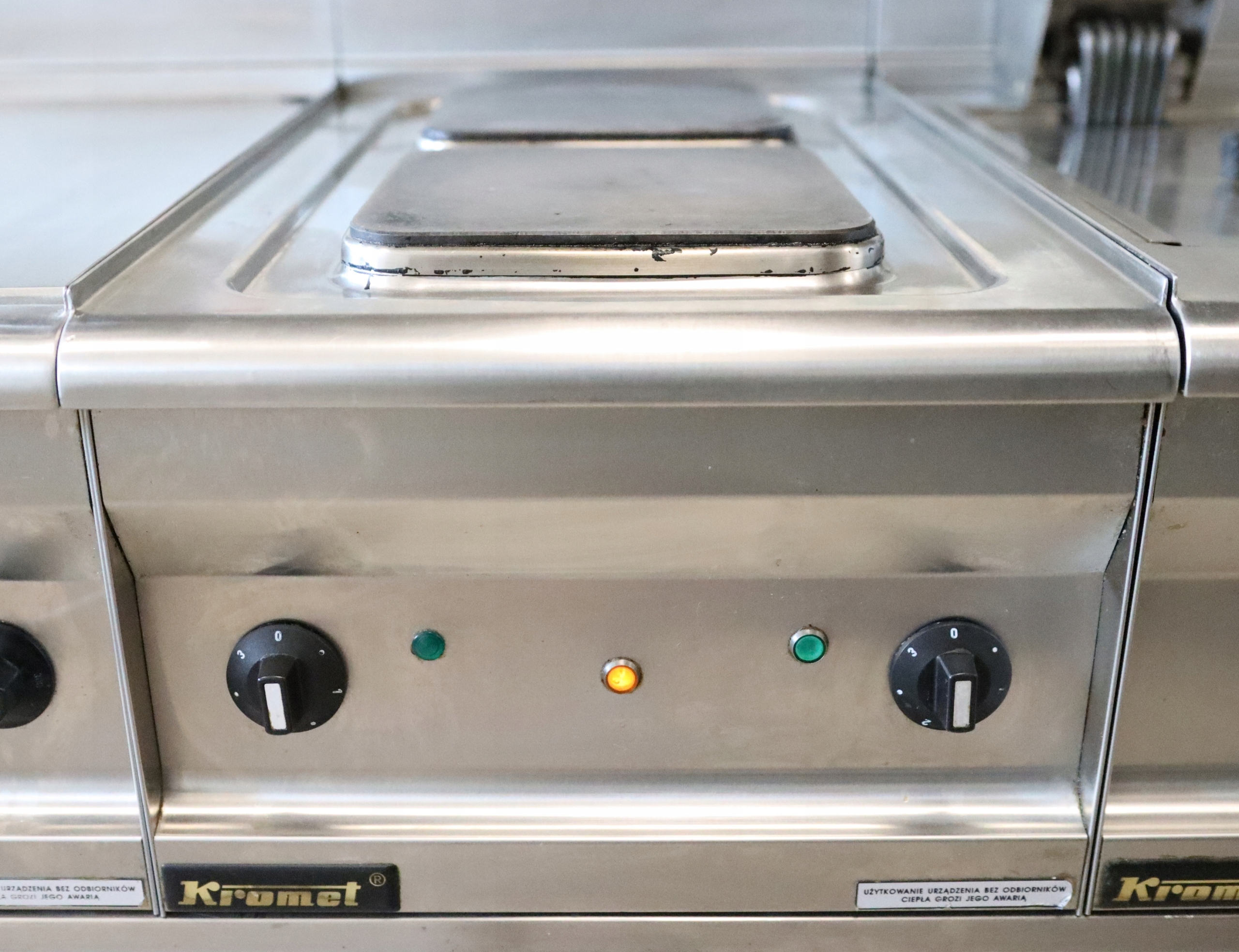 Kuchnia nastawna elektryczna z dwiema płytami. Płyty sterowane oddzielnie za pomocą stopniowych pokręteł. Umożliwia to efektywne zarządzanie mocą cieplną urządzenia i zwiększa wydajność.