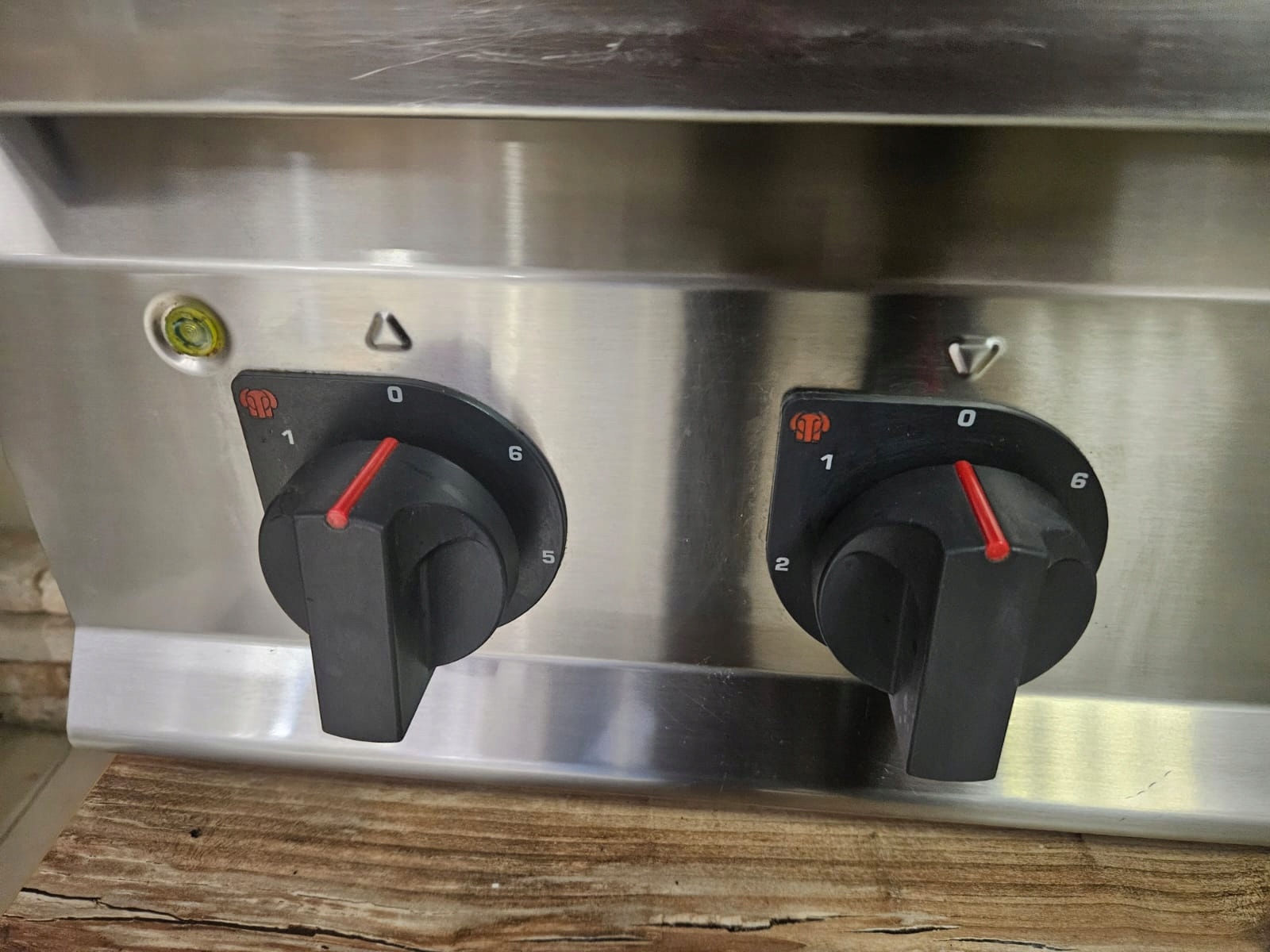 Płaszczyzna robocza oraz panele przednie wykonane ze stali. nierdzewnej inox AISI 304.Płaszczyzna tłoczona w jednym kawałku, szczelna. Płyty zeliwne z termostatem awaryjnym i 6-scio pozycyjnym selektorem uaktywniajacym 6 róznych koncentrycznych stref mocy.Lampki kontrolne napiecia i pracy.