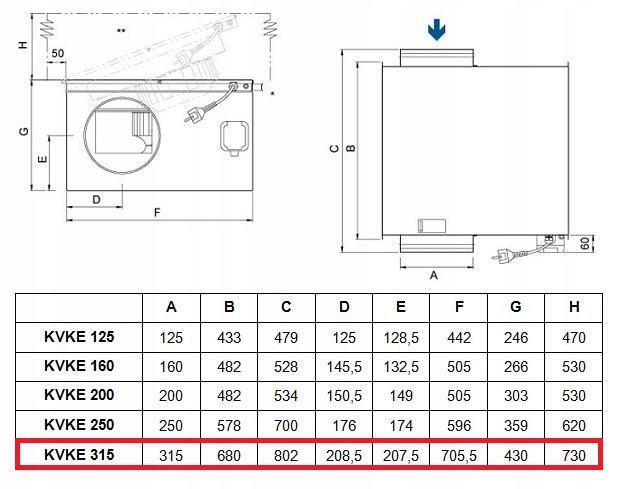Wentylator KVKE 315M wyposażony jest w koło wirnikowe o łopatkach wygiętych do tyłu; zespół silnik-koło wirnikowe zamocowany jest na uchylnej pokrywie; obudowa wykonana z galwanizowanej blachy stalowej, izolowana termicznie i akustycznie 50mm warstwą wełny mineralnej; silnik z wirującą obudową, przystosowany do regulacji napięciowej, z zabezpieczeniem termicznym; montaż w dowolnej pozycji; stopień ochrony IP44; max temperatura przetłaczanego czynnika: +60OC.
