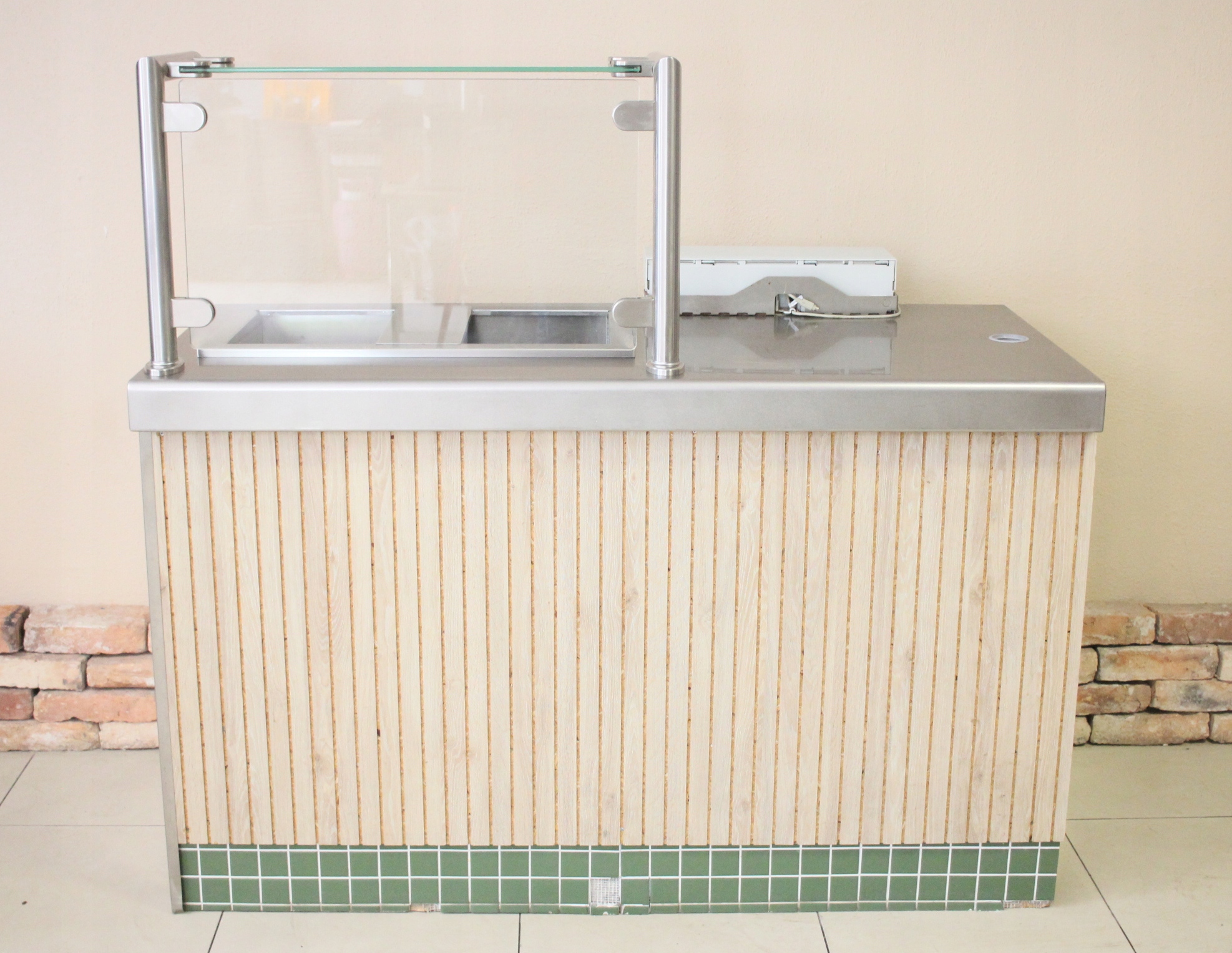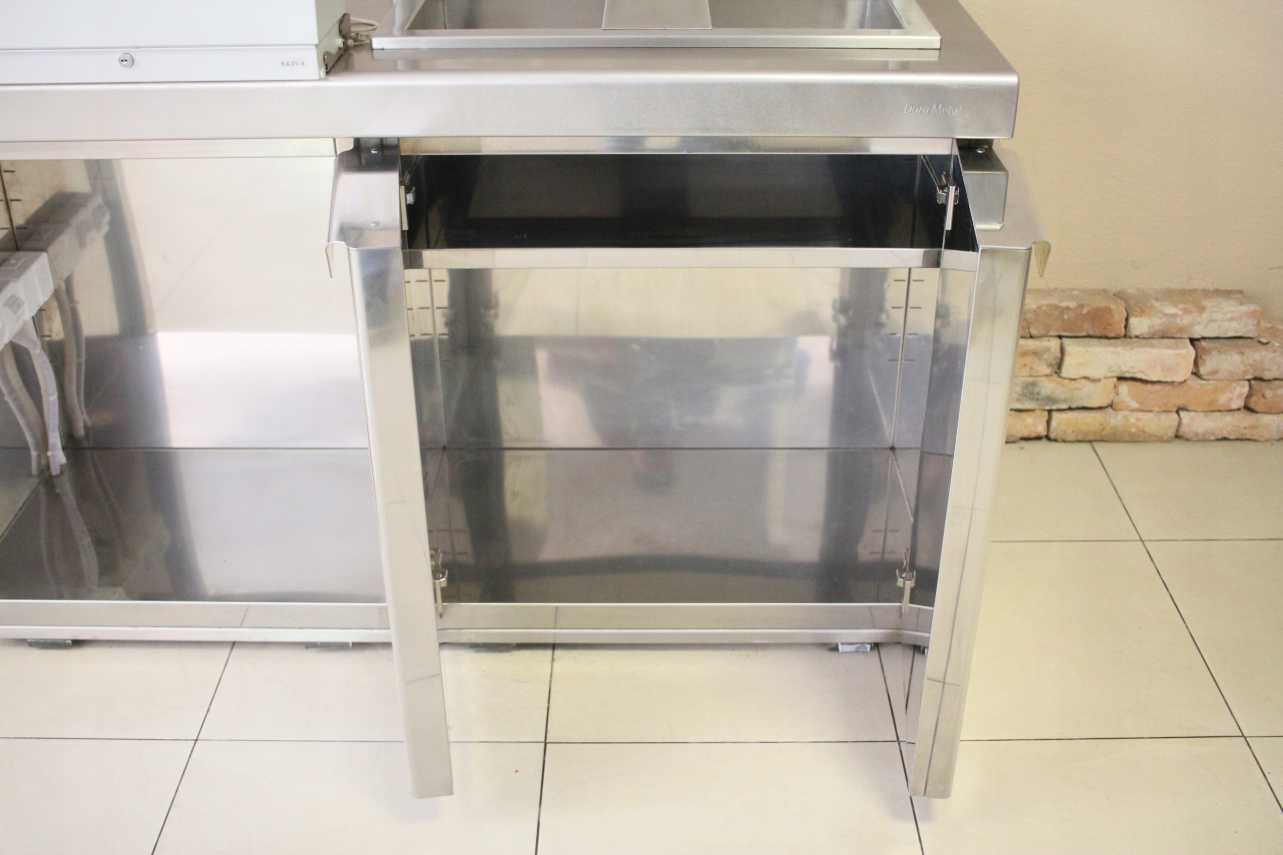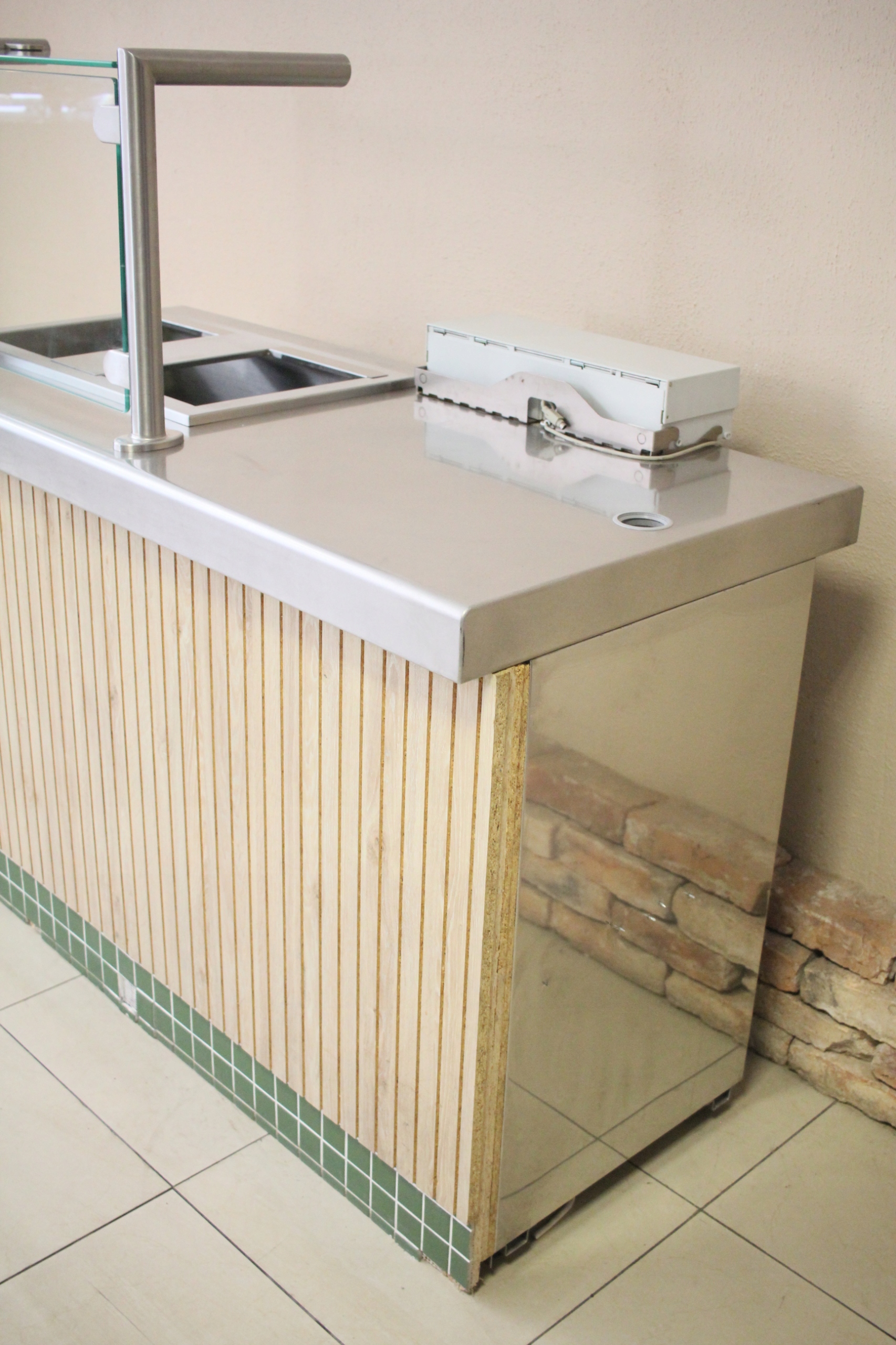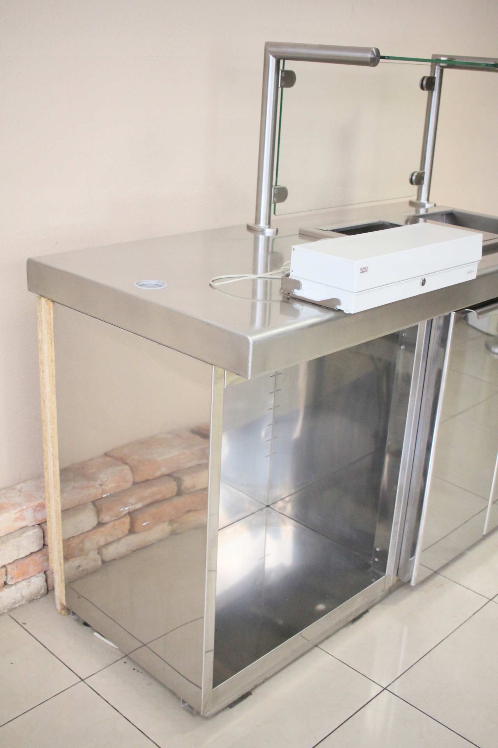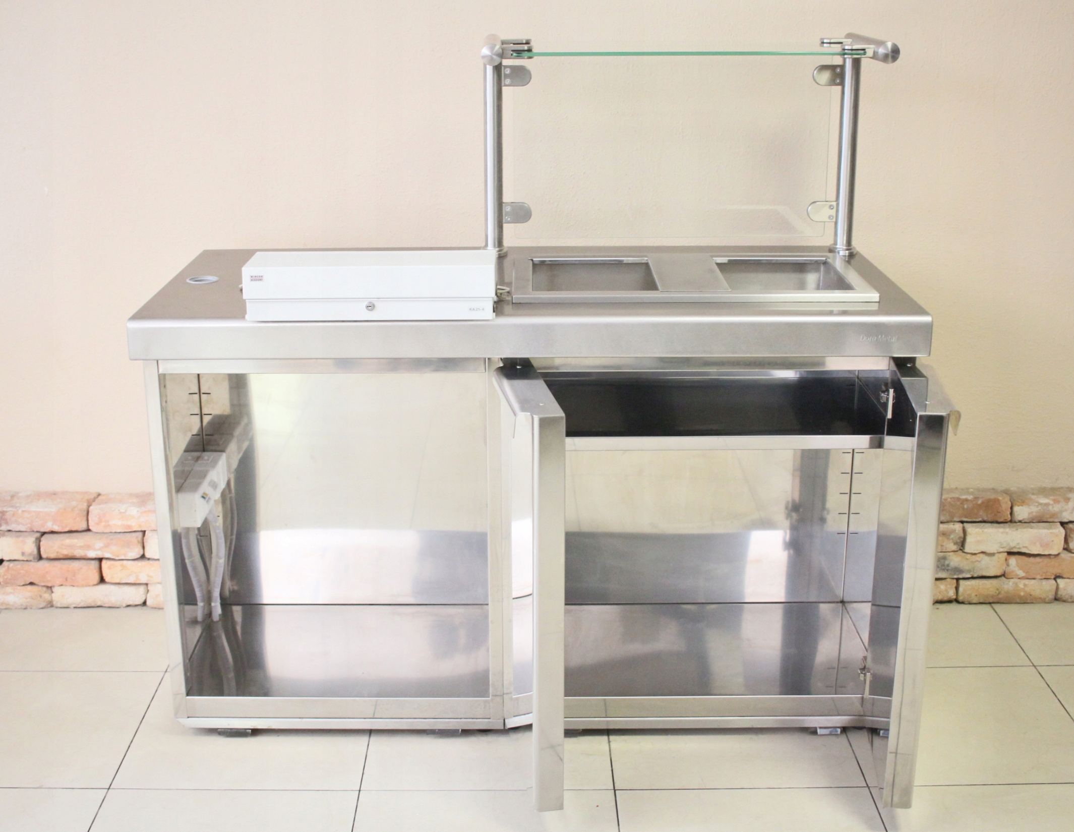Lada bufetowa i wydawcza Dora Metal o szerokości 150 cm i głębokości 70 cm, wykonana ze stali nierdzewnej, używana, w bardzo dobrym stanie technicznym. Mebel przystosowany do montażu bemarów lub kasy fiskalnej, wyposażony w otwory na kable i gniazdka zasilające, co ułatwia organizację stanowiska sprzedażowego. Solidna konstrukcja i elegancki wygląd sprawiają, że lada sprawdzi się w restauracjach, hotelach, pubach czy stołówkach, wspierając sprawną obsługę gości.