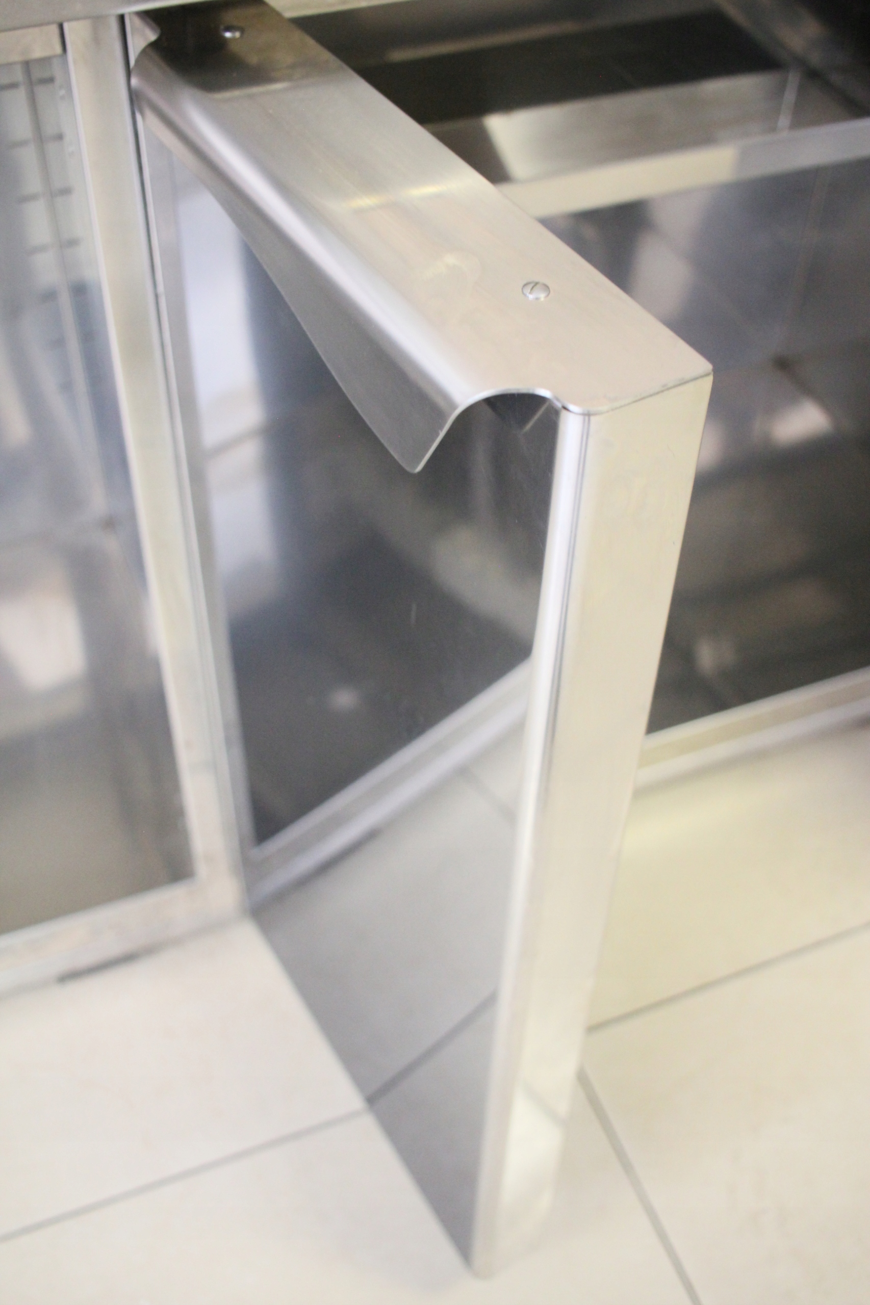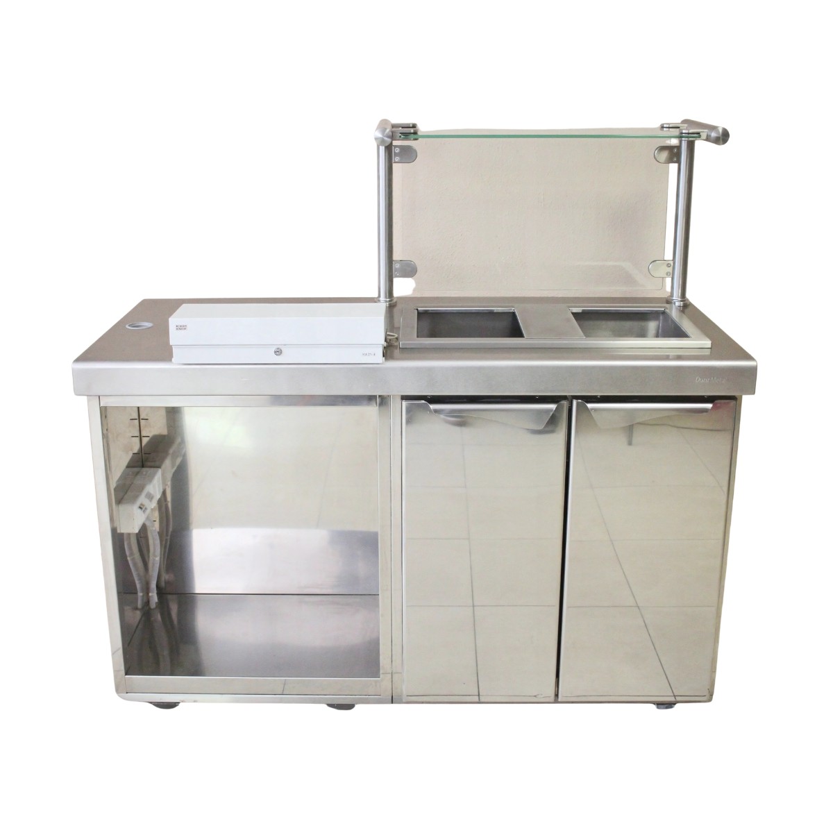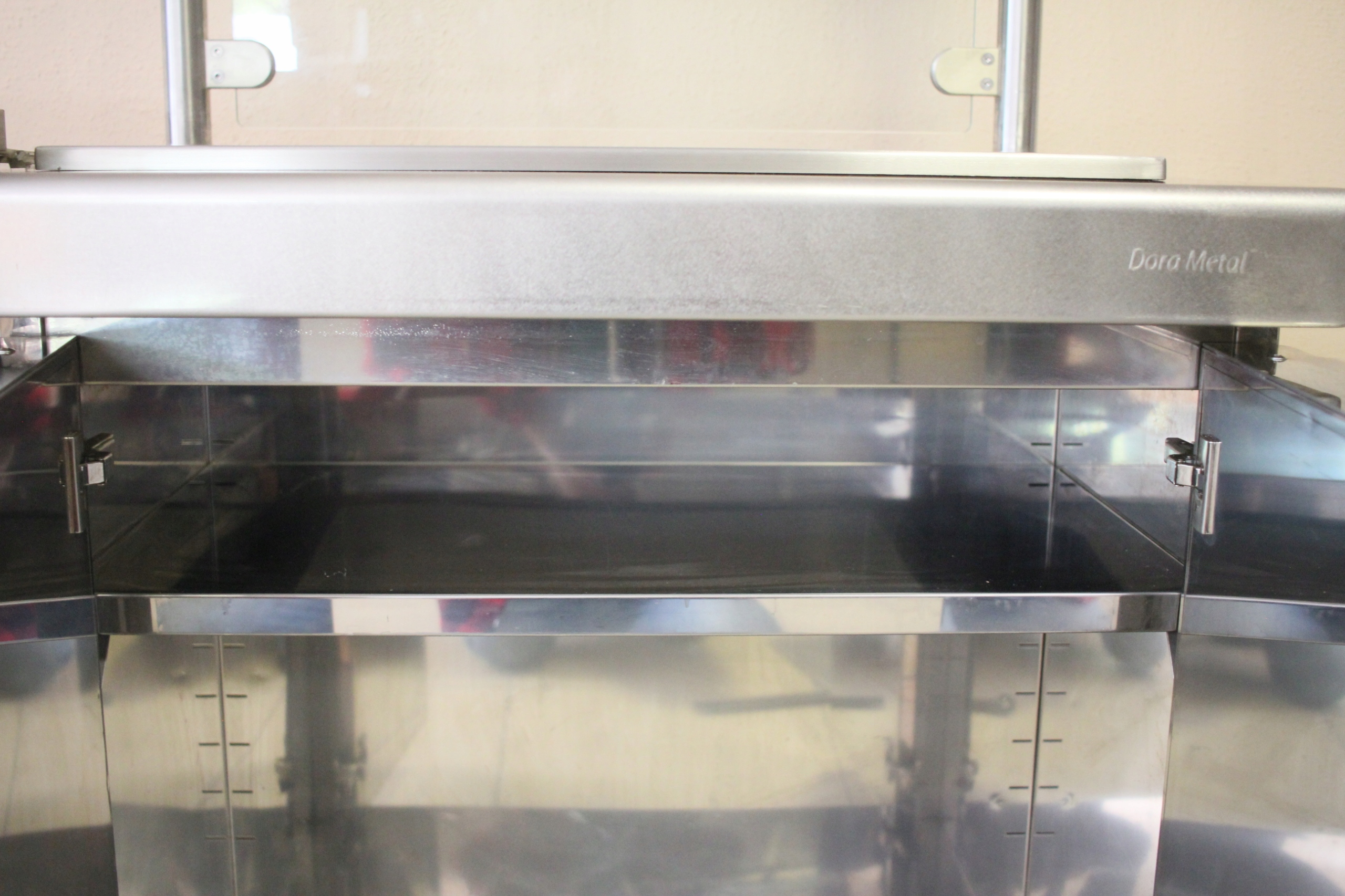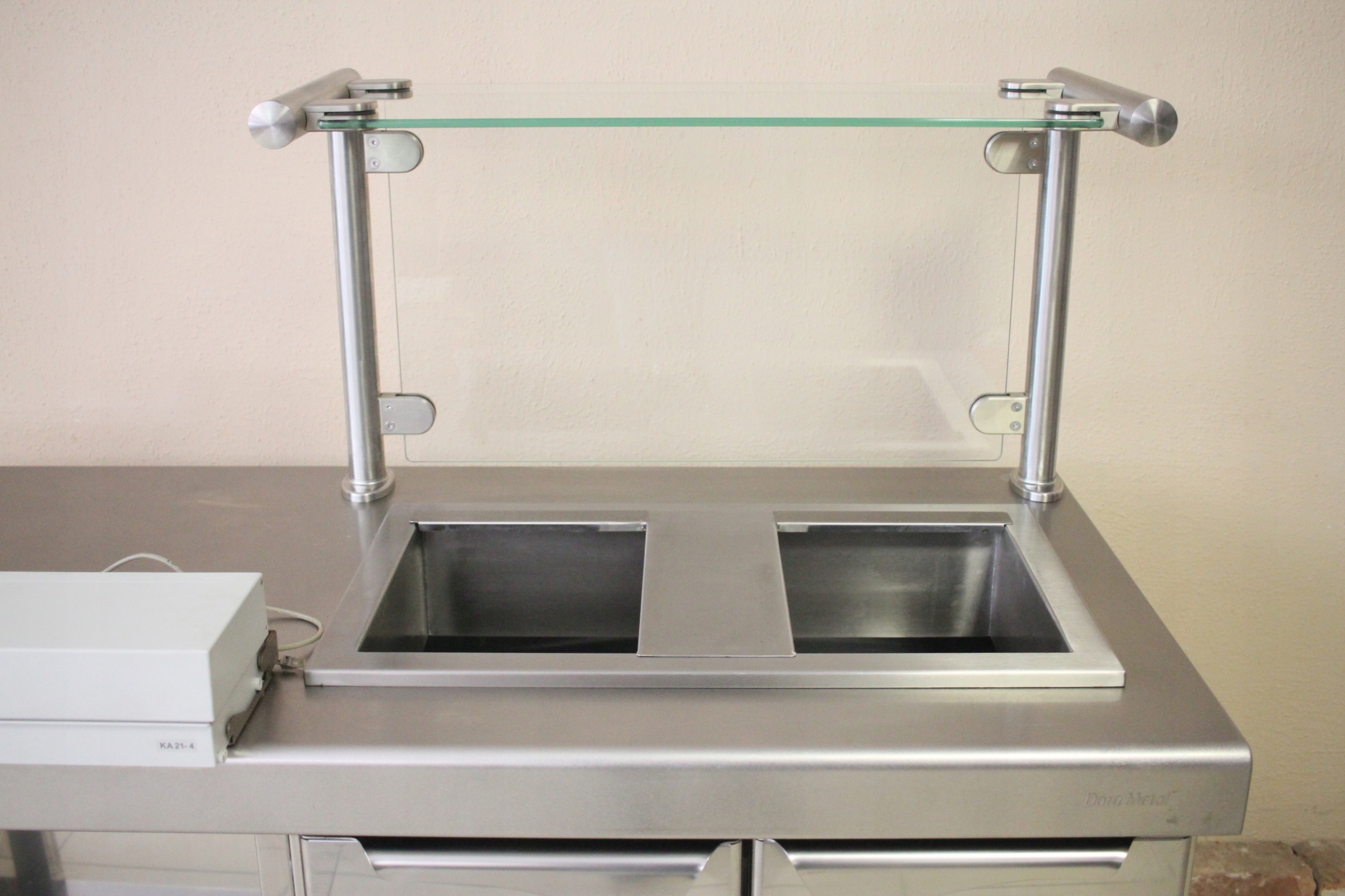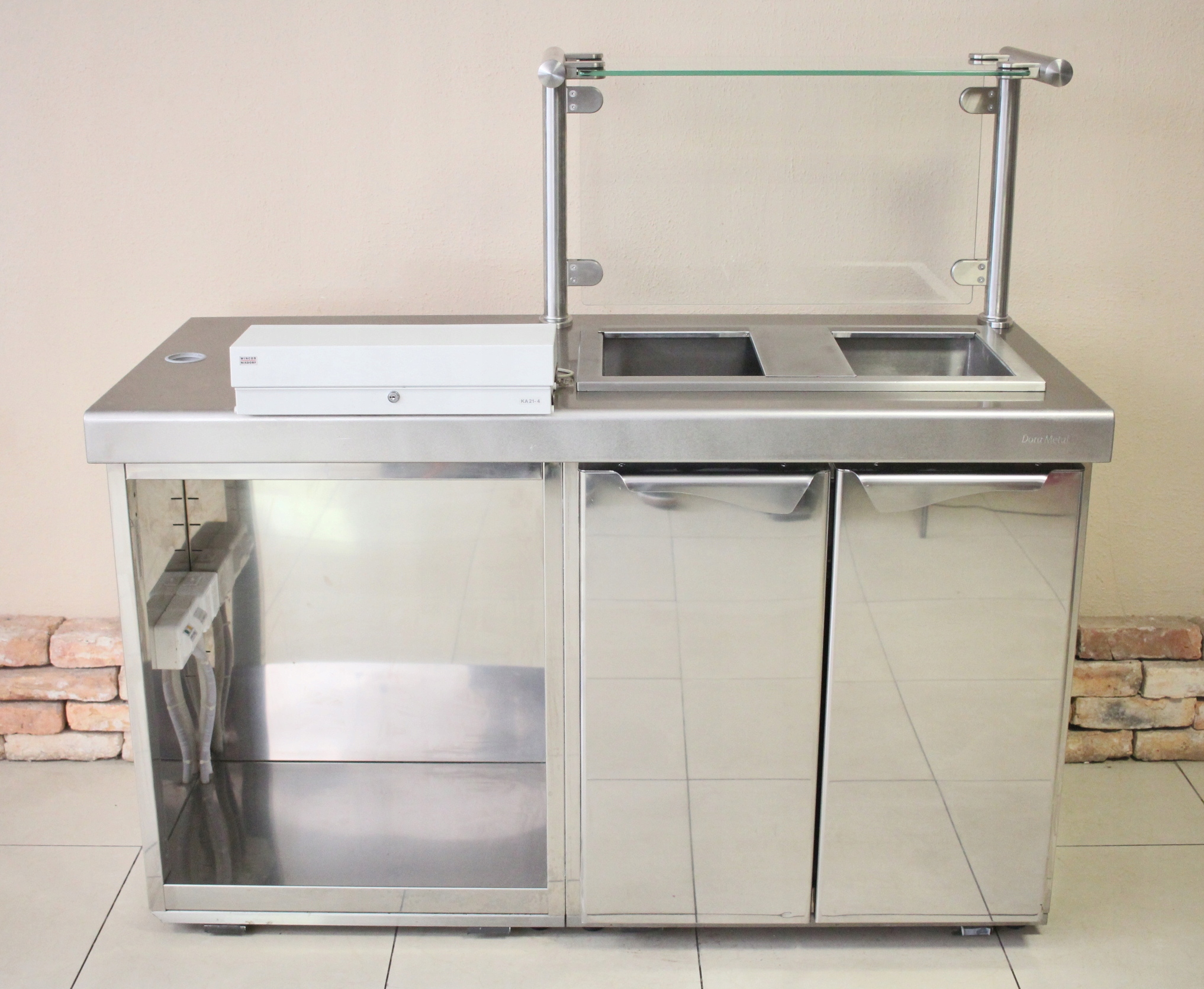 Lada bufetowa i wydawcza Dora Metal o szerokości 150 cm i głębokości 70 cm, wykonana ze stali nierdzewnej, używana, w bardzo dobrym stanie technicznym. Mebel przystosowany do montażu bemarów lub kasy fiskalnej, wyposażony w otwory na kable i gniazdka zasilające, co ułatwia organizację stanowiska sprzedażowego. Solidna konstrukcja i elegancki wygląd sprawiają, że lada sprawdzi się w restauracjach, hotelach, pubach czy stołówkach, wspierając sprawną obsługę gości.