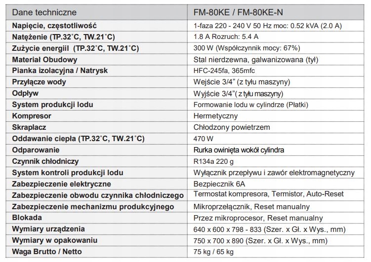 Modele FM-80KE (-N) to kompaktowe urządzenia z wbudowanym zbiornikiem na lód produkujące płatki lub bryłki lodowe. Płatki („flake”) i bryłki („nugget”) lodowe to idealny materiał do chłodzenia i ekspozycji świeżych produktów mający również zastosowanie w medycynie i transporcie medycznym. Lód ten jest również idealny do przygotowywania koktajli i napojów.