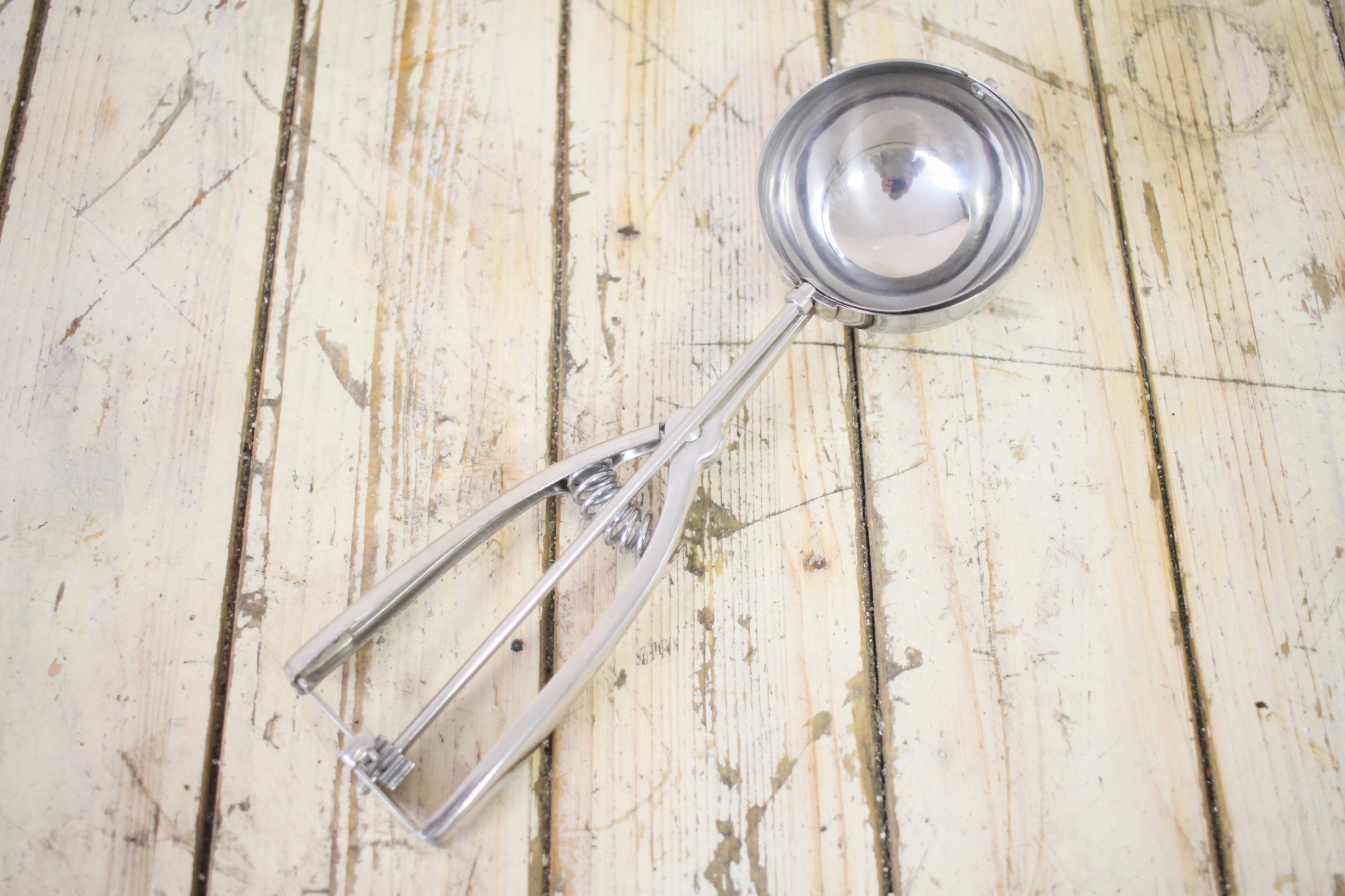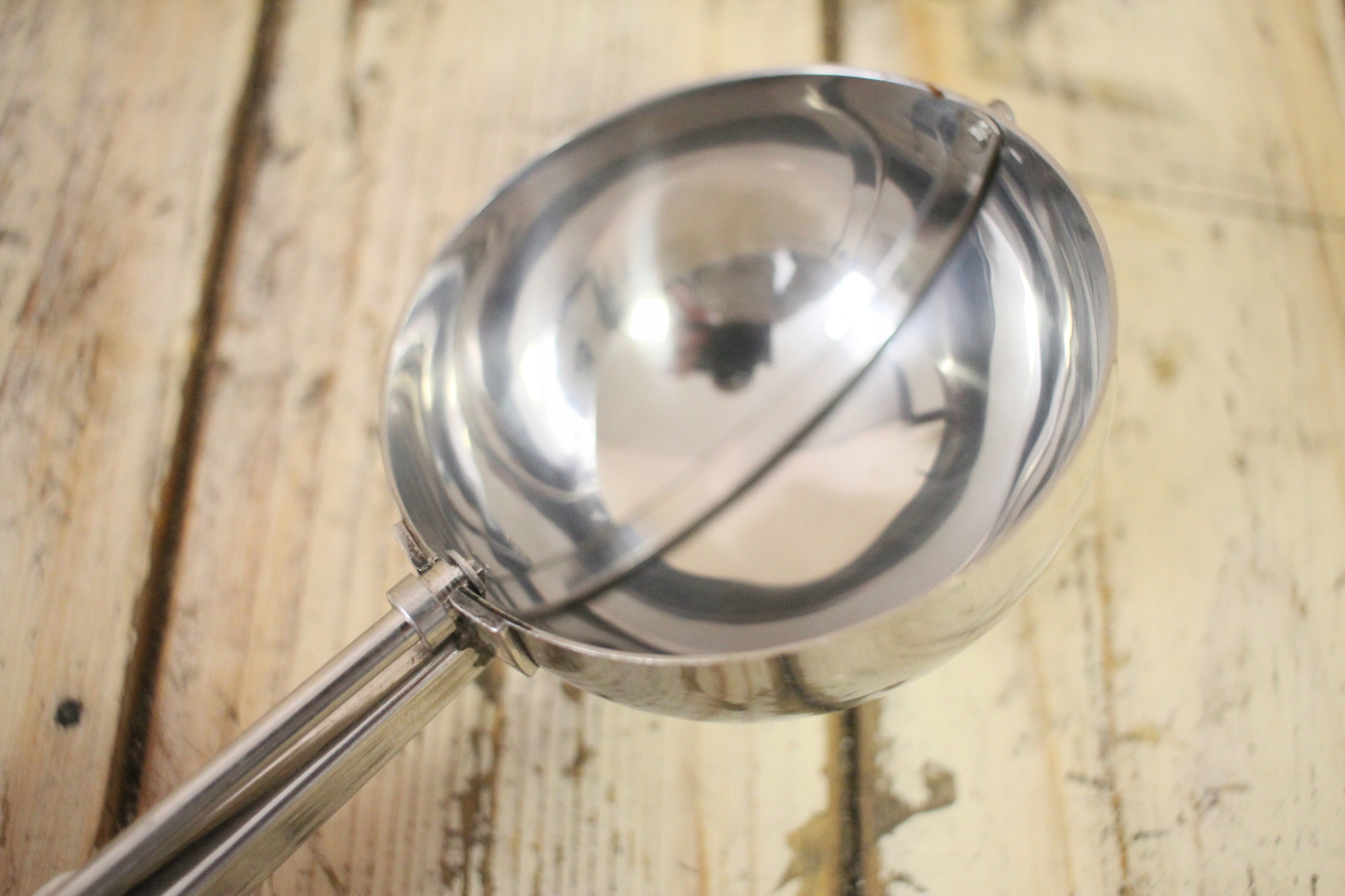 mamy do sprzedania widoczną na zdjęciach gałkownicę do lodów. Przedmiot w całości wykonany ze stali nierdzewnej. Gałkownica była używana, posiada niewielkie ślady użytkowania.