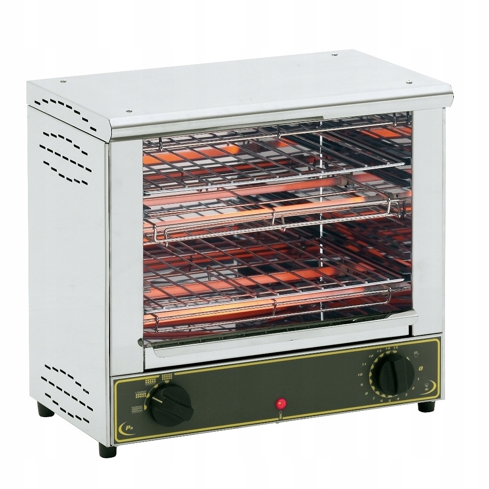 Opiekacz BAR-2000 marki ROLLER GRILL idealny do opiekania bułek i zapiekanek. Wykonanie – stal nierdzewna. Urządzenie błyskawicznie się rozgrzewa dzięki kwarcowym grzałkom. Maksymalną temperaturę osiąga w mniej niż 30 sekund. Daje to możliwość upieczenia około 300 tostów w godzinę. Niezależne sterowanie dolnym i górnym poziomem grzania. W wyposażeniu dwa ruszty z regulacją wysokości. Opiekacz posiada czasowy wyłącznik z możliwością przełączenia na pracę ciągłą. Urządzenie ma zabezpieczenie przed przegrzaniem. Regulacja temperatury oraz czasu opiekania przy pomocy pokrętła.
