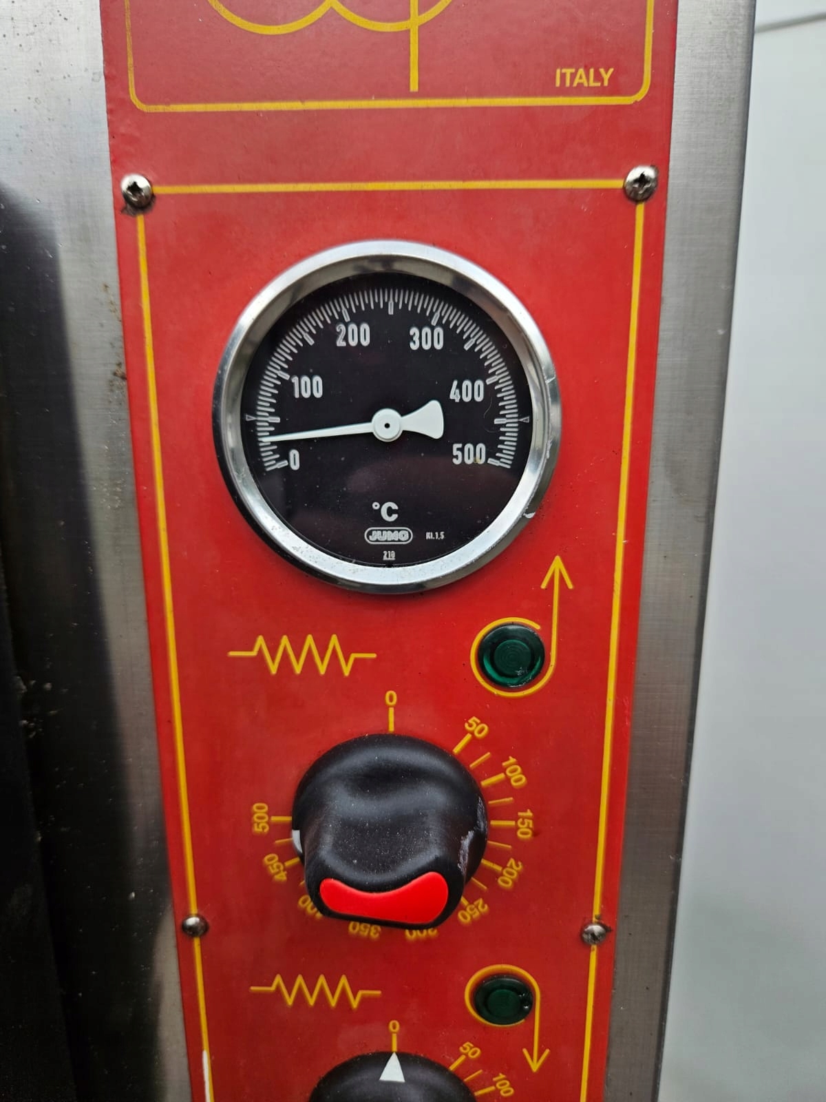 Profesjonalny piec do pizzy wyposażony w komorę pieczenia zaprojektowaną i zoptymalizowaną dla pizz o średnicy 36 cm. Front dostępny z wykończeniem ze stali nierdzewnej. Urządzenie posiada regulację poprzez niezależne termostaty mechaniczne, zarówno dla góry jak i spodu pieca, izolację z odparowanej wełny mineralnej wysokiej gęstości, powierzchnię pieczenia z kamienia ogniotrwałego, pirometr i wewnętrzne oświetlenie halogenowe.