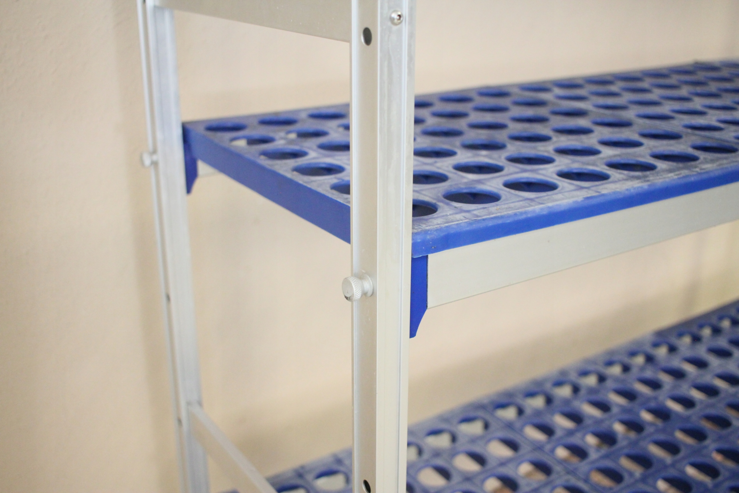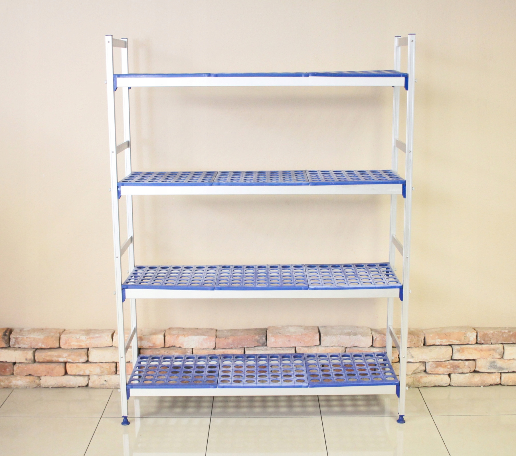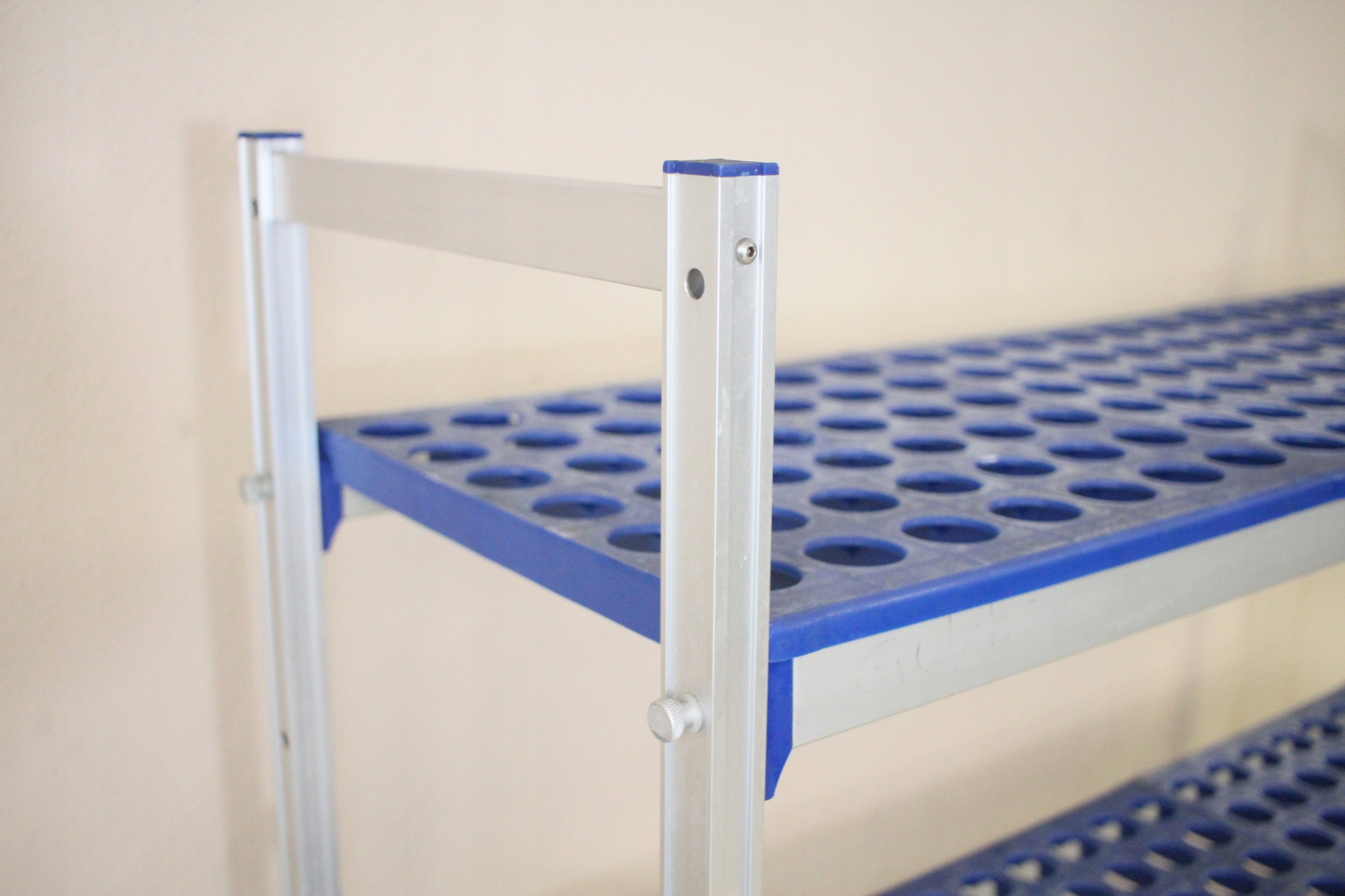 Regał z anodyzowanego aluminium z półkami przeznaczonymi do kontaktu z żywnością. Przystosowany do różnorodnego zastosowania, zwłaszcza w pomieszczeniach o wysokich wymogach sanitarnych – idealny do komór chłodniczych i mroźniczych. Łatwy montaż. Regulowana wysokość nóżek pozwala na dostosowanie do nierówności podłoża. Regał posiada 4 półki.