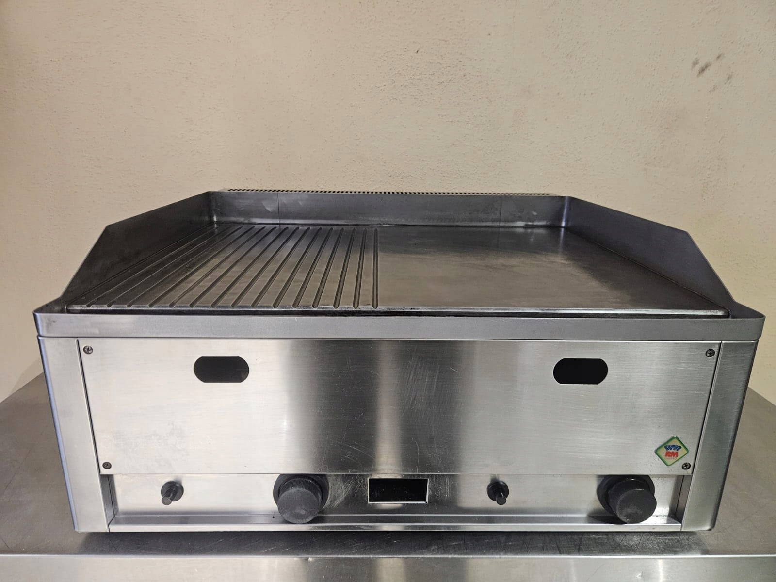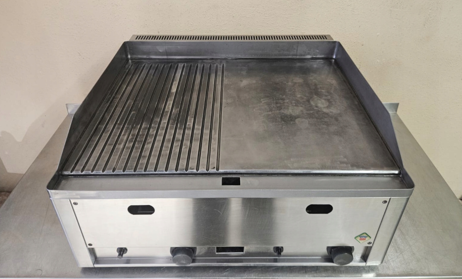Płyta grillowa o zasilaniu gazowym w obudowie ze stali nierdzewnej. Płyta robocza w połowie gładka i w połowie ryflowana wykonana z trudnościeralnej stali. Przeznaczona do grillowania potraw mięsnych i warzyw. Płyta robocza posiada ranty co zabezpiecza przed wypadaniem produktów poza urządzenie. Grubość płyty 10 mm gwarantuje odpowiednie rozprowadzenie ciepła na całej powierzchni. Dwie strefy grzewcze niezależnie sterowane. Zapalacz piezoelektryczny.