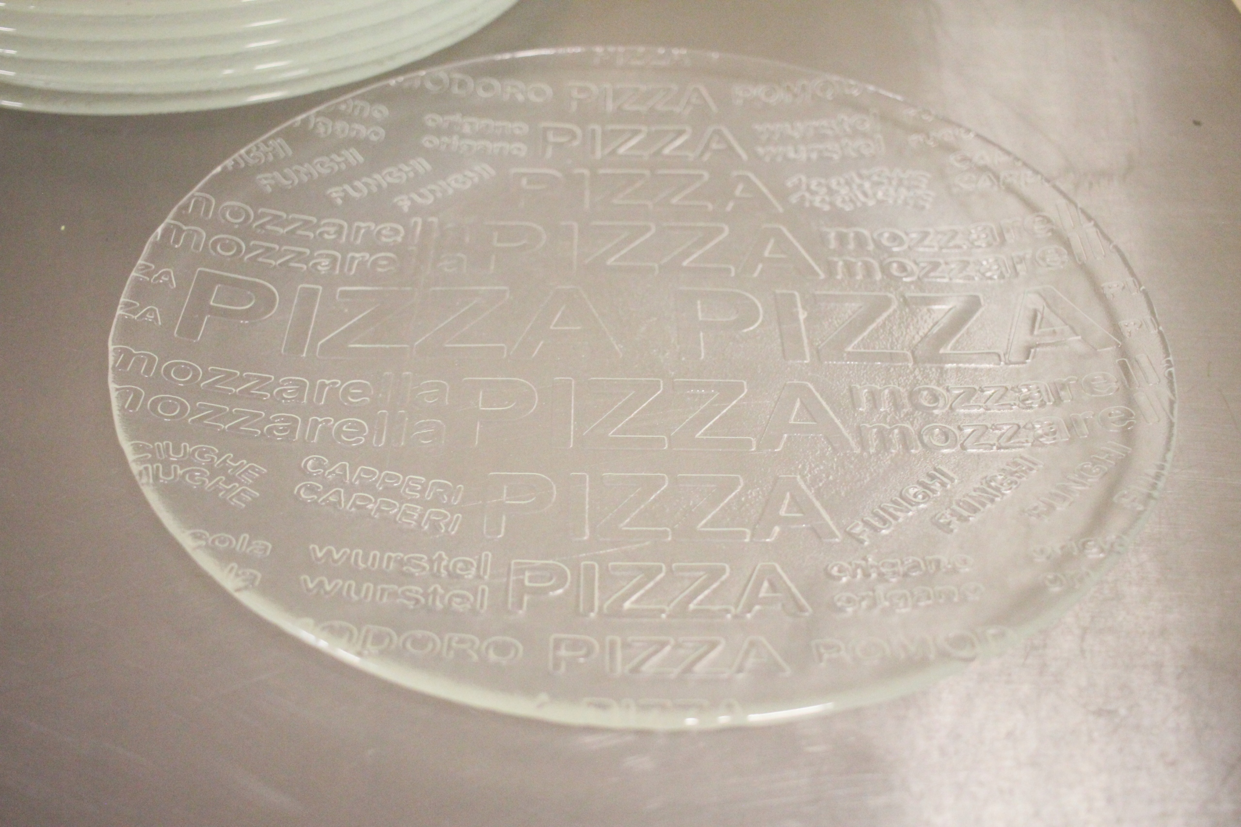 Szklany talerz do pizzy z napisami. Idealnie sprawdza się zarówno w domu, jak i w profesjonalnych pizzeriach.