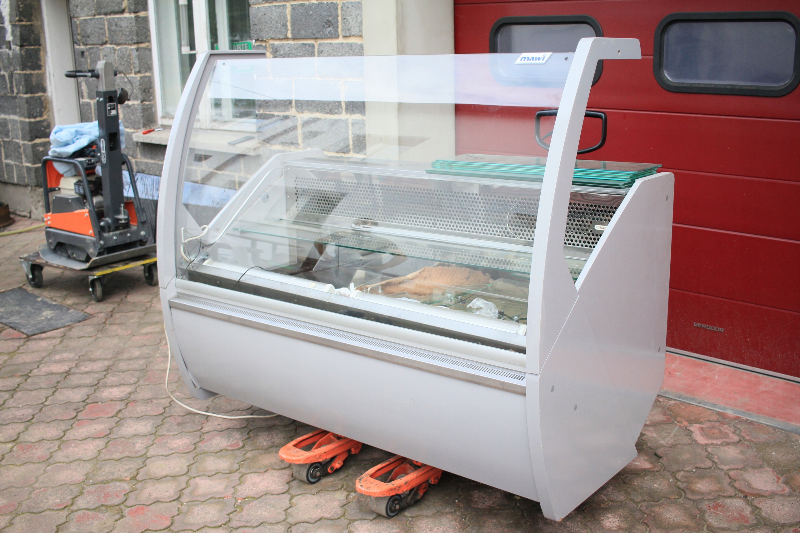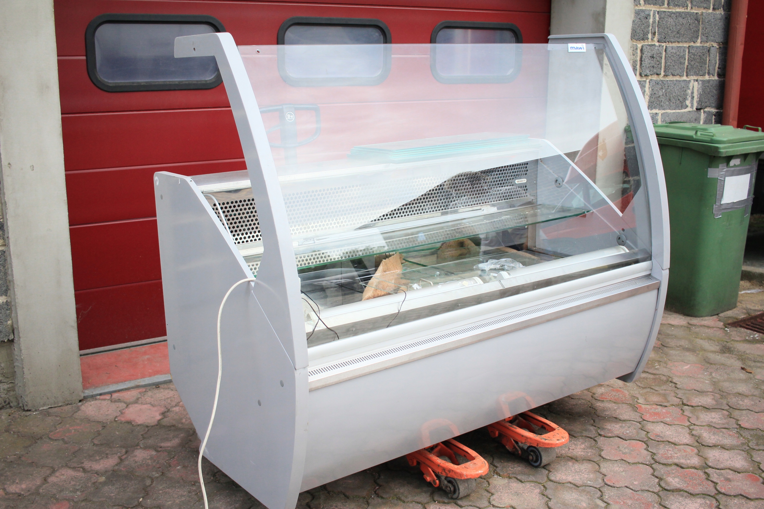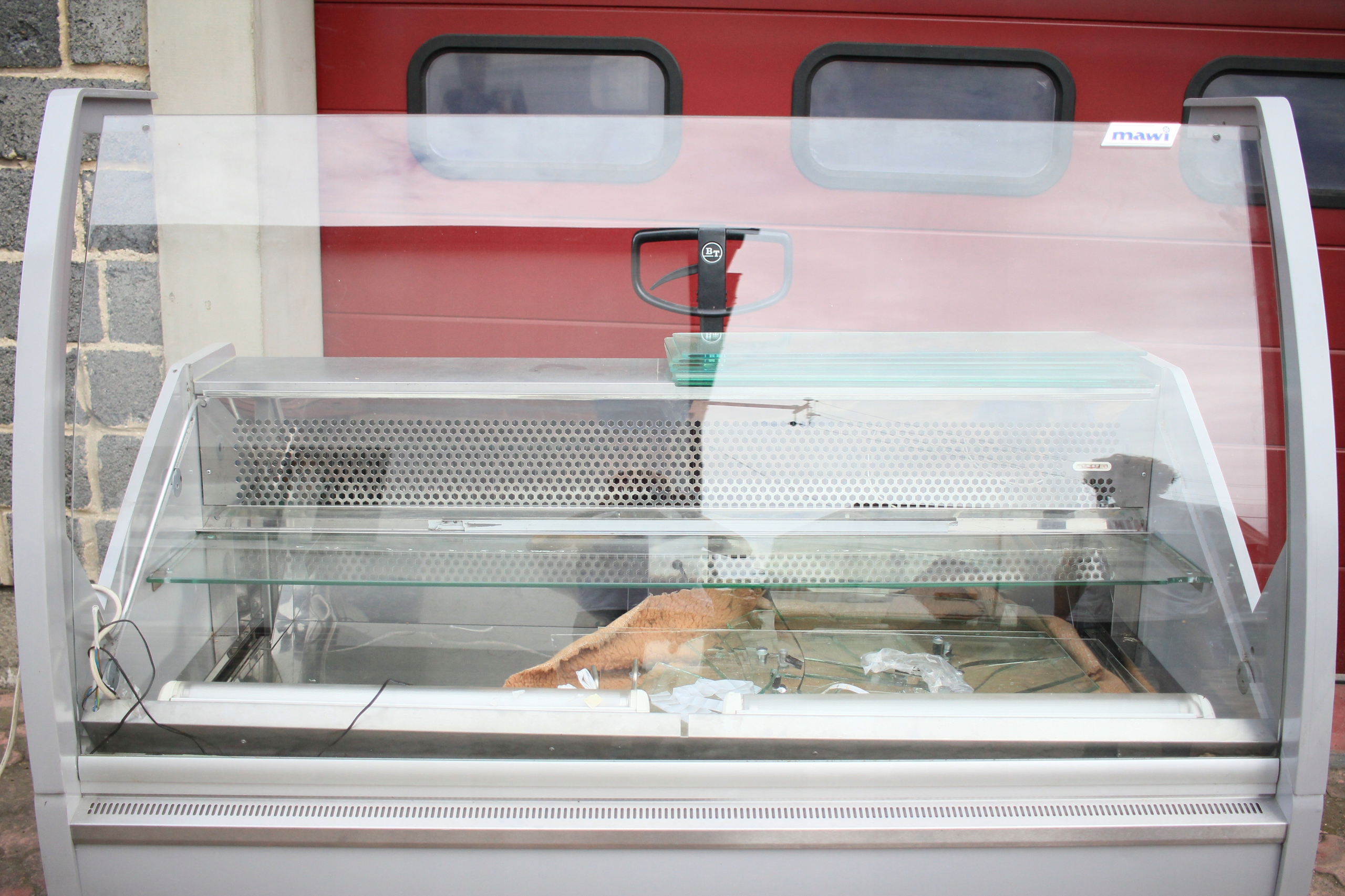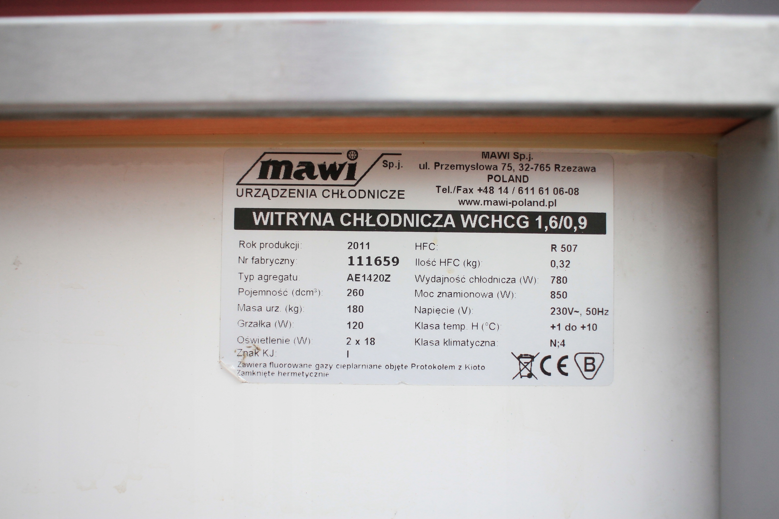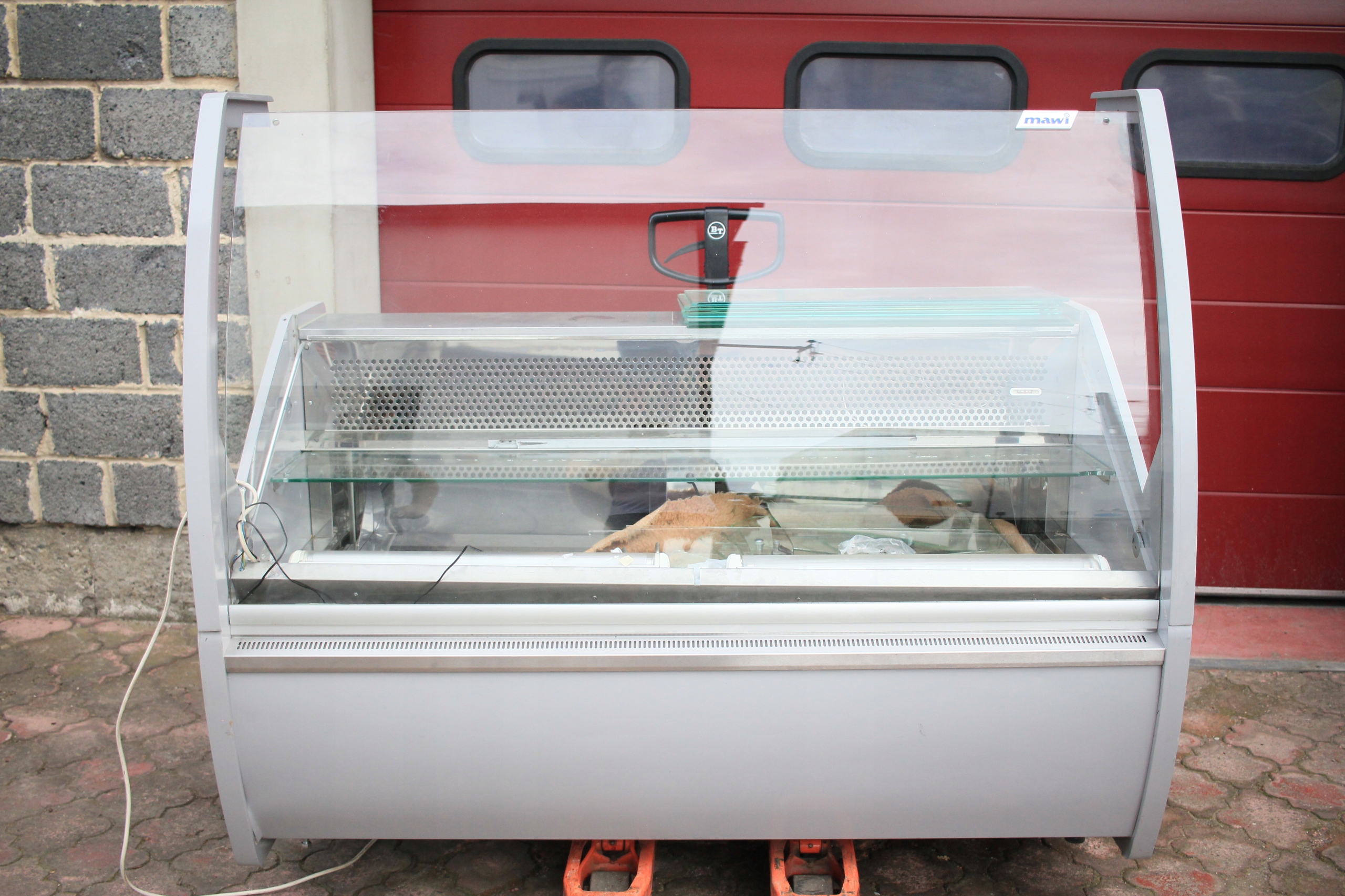 Witryna cukiernicza Mawi WCHCR 1.6/0.9 M z bokami MDF i oświetleniem LED, przeznaczona do ekspozycji wyrobów cukierniczych w obniżonej temperaturze. Urządzenie jest uszkodzone — wymaga naprawy układu chłodniczego i uzupełnienia brakujących szyb (brak 2 z 3 szyb). Poza tym kompletna, z wbudowanym agregatem chłodniczym i pełnym wyposażeniem technicznym. Nowa witryna tego modelu to koszt ponad 7000 zł, co daje możliwość znacznych oszczędności przy renowacji.