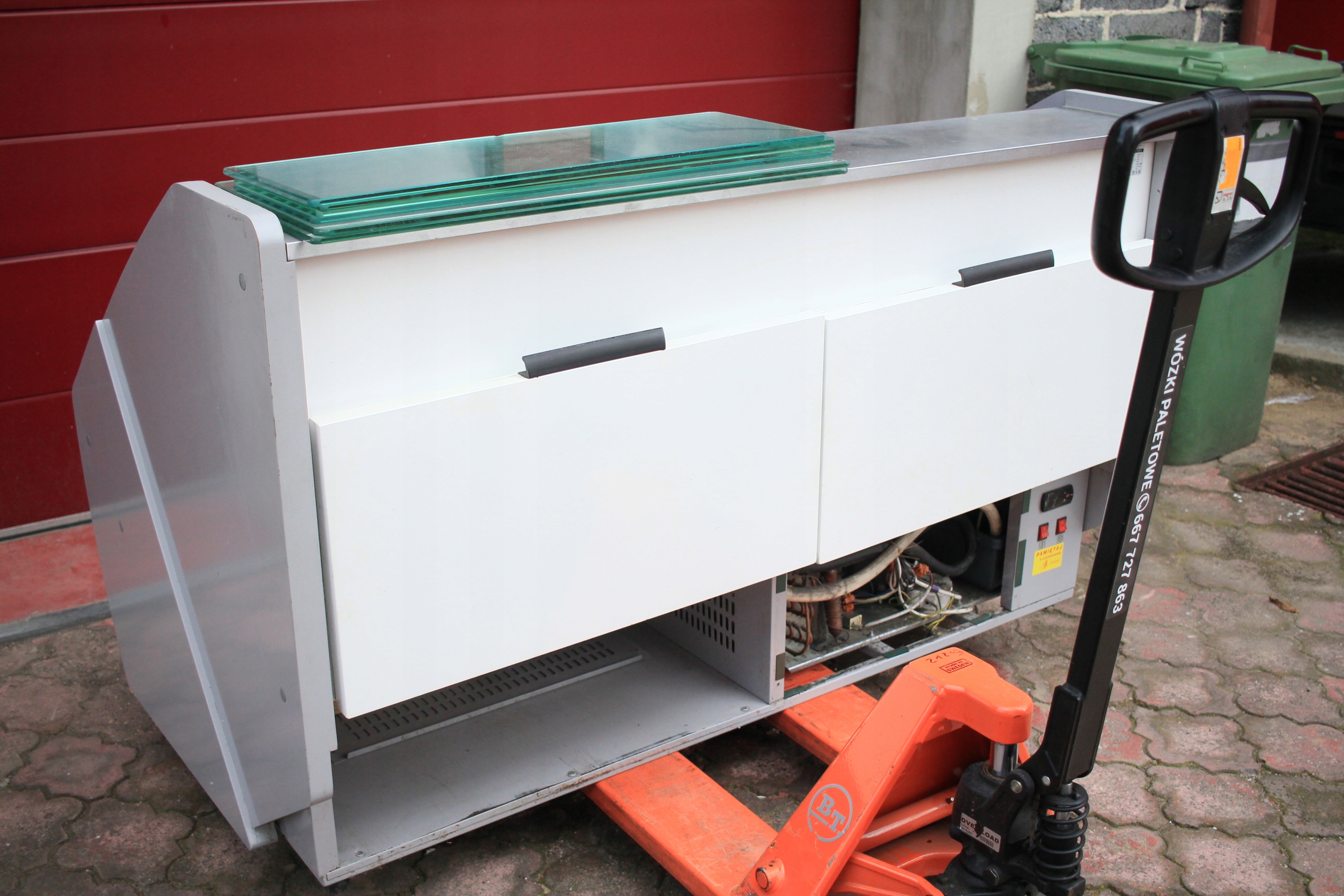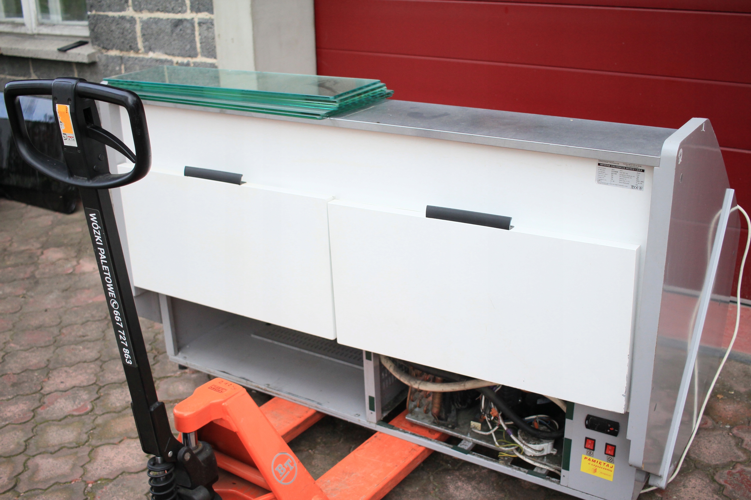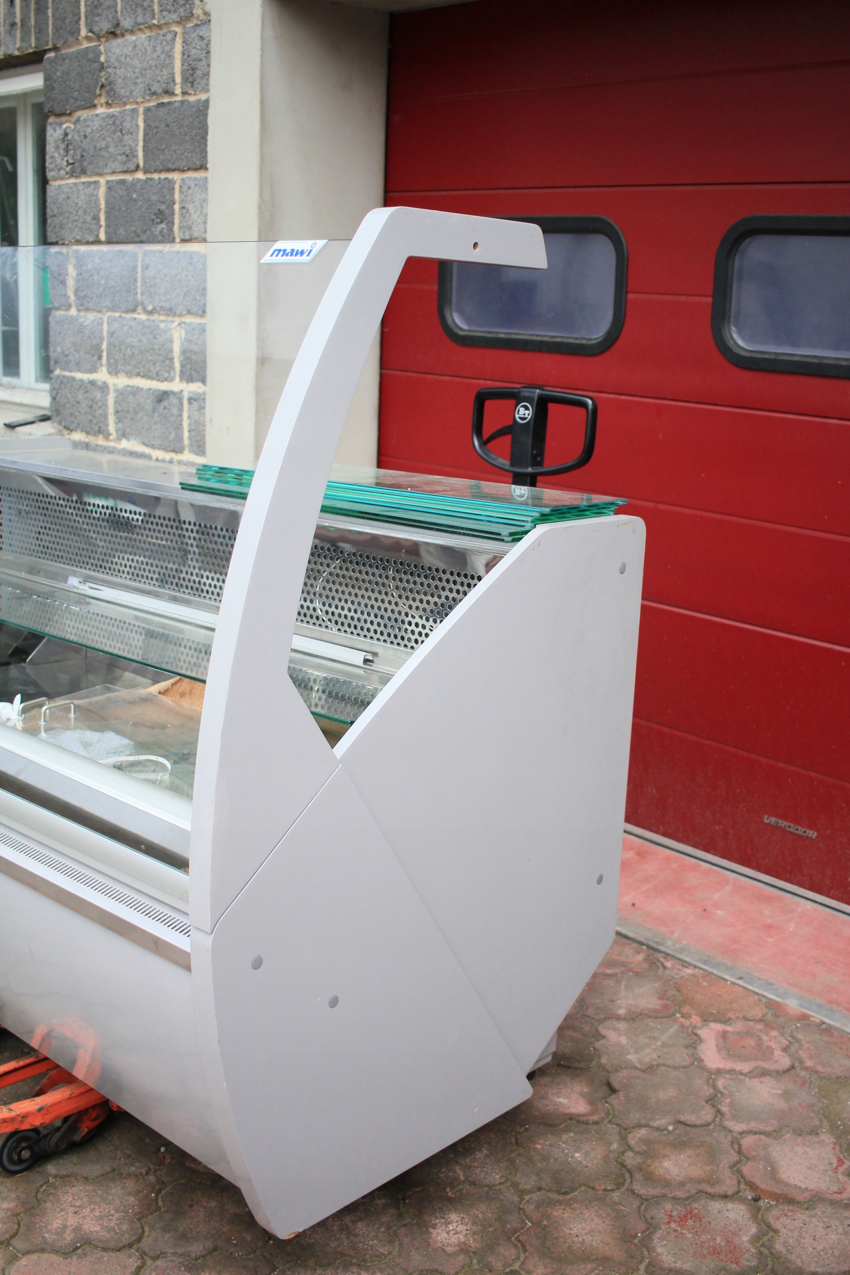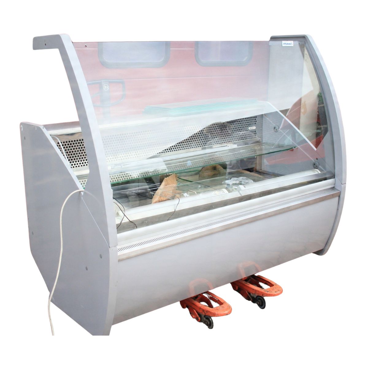 Witryna cukiernicza Mawi WCHCR 1.6/0.9 M z bokami MDF i oświetleniem LED, przeznaczona do ekspozycji wyrobów cukierniczych w obniżonej temperaturze. Urządzenie jest uszkodzone — wymaga naprawy układu chłodniczego i uzupełnienia brakujących szyb (brak 2 z 3 szyb). Poza tym kompletna, z wbudowanym agregatem chłodniczym i pełnym wyposażeniem technicznym. Nowa witryna tego modelu to koszt ponad 7000 zł, co daje możliwość znacznych oszczędności przy renowacji.