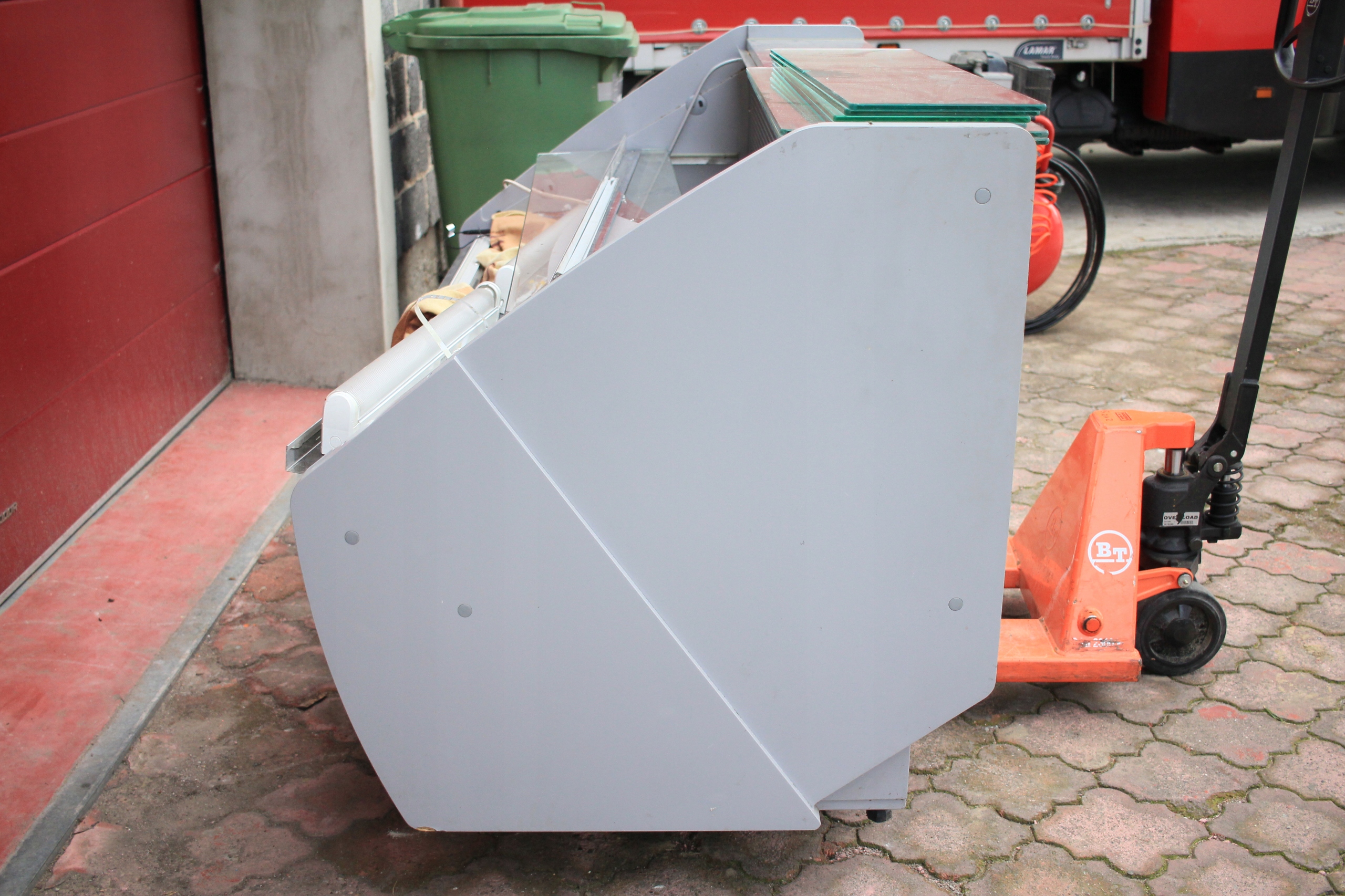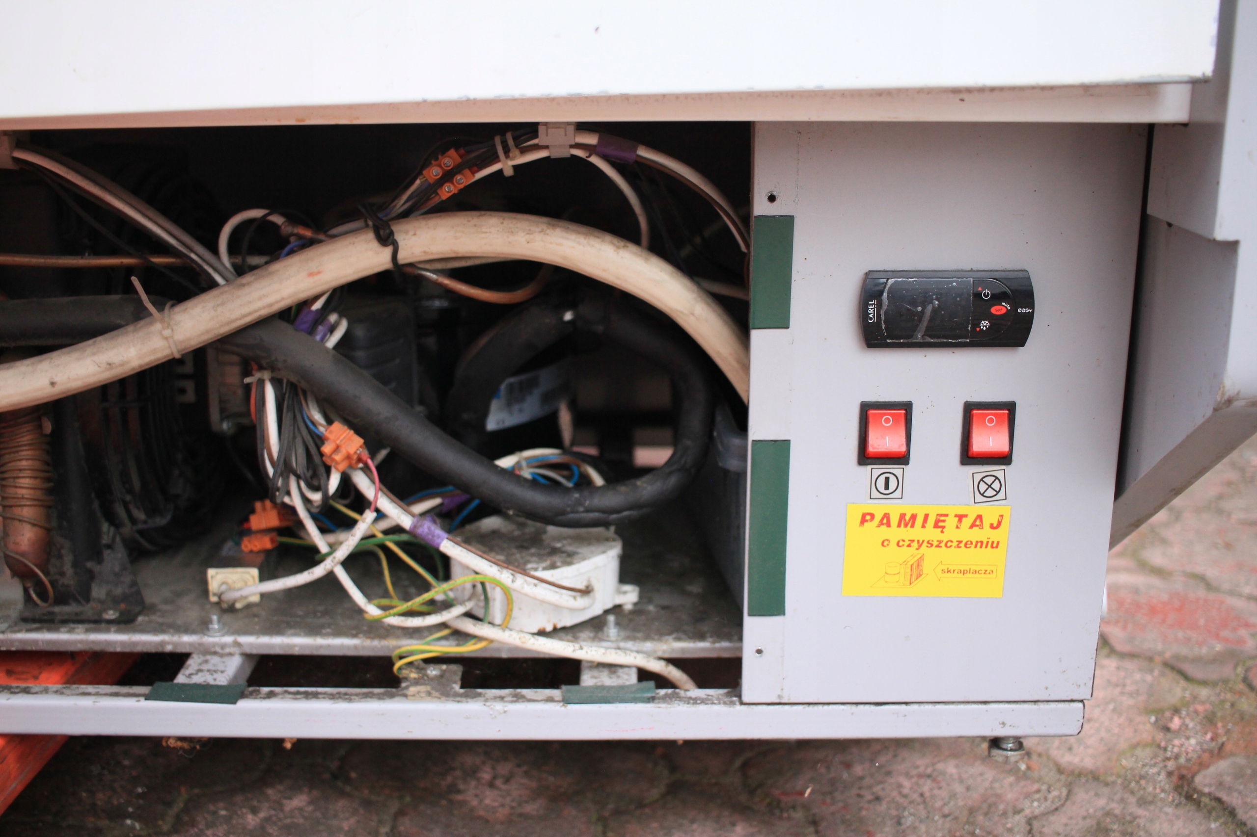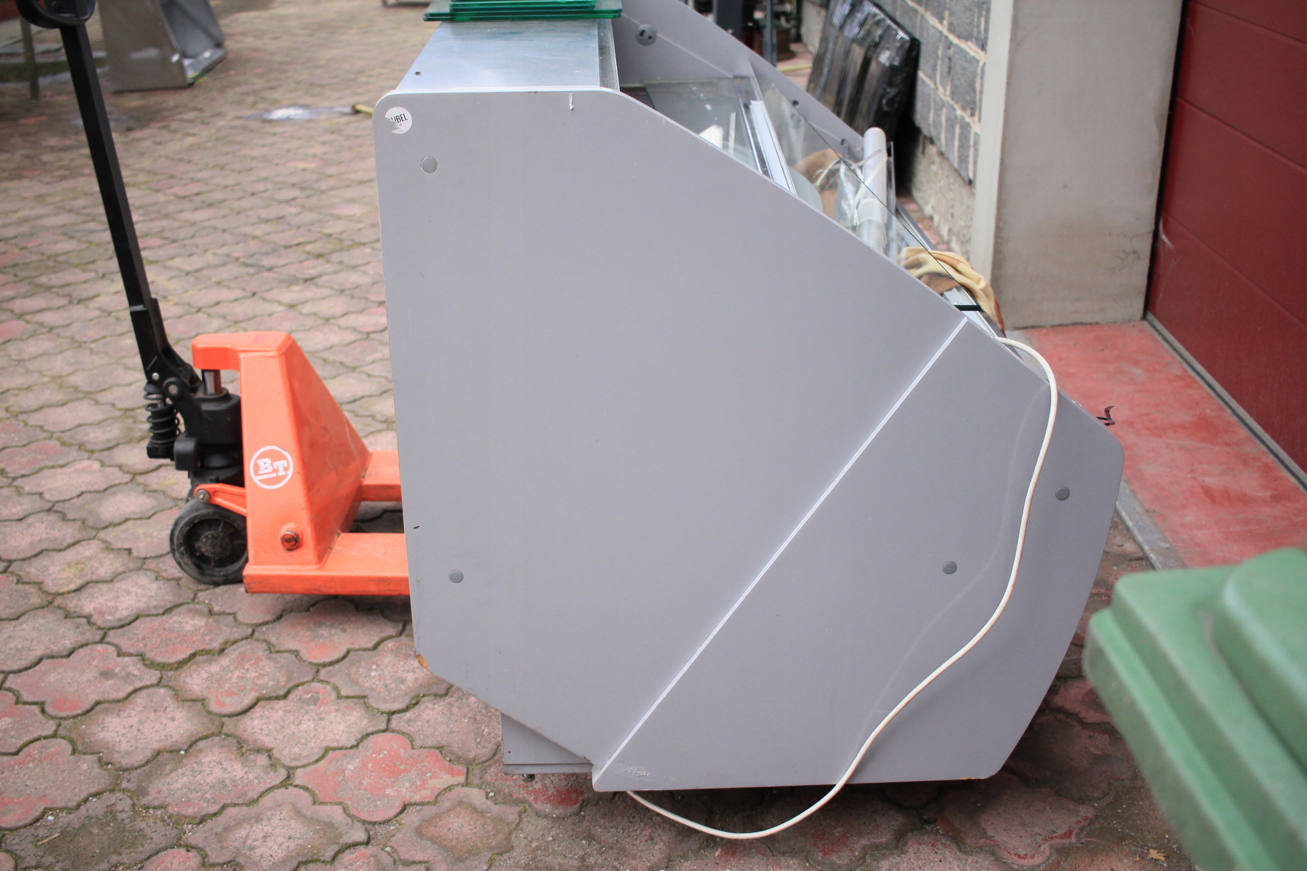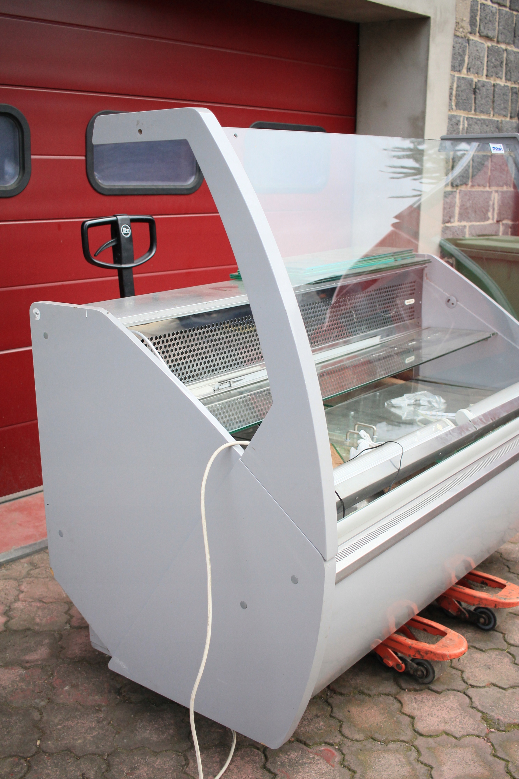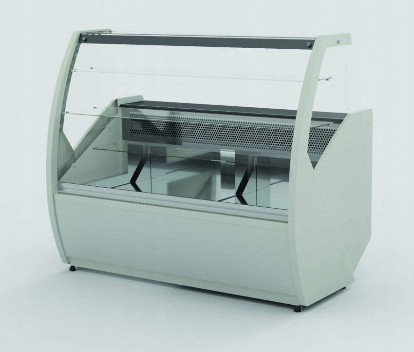 Witryna cukiernicza Mawi WCHCR 1.6/0.9 M z bokami MDF i oświetleniem LED, przeznaczona do ekspozycji wyrobów cukierniczych w obniżonej temperaturze. Urządzenie jest uszkodzone — wymaga naprawy układu chłodniczego i uzupełnienia brakujących szyb (brak 2 z 3 szyb). Poza tym kompletna, z wbudowanym agregatem chłodniczym i pełnym wyposażeniem technicznym. Nowa witryna tego modelu to koszt ponad 7000 zł, co daje możliwość znacznych oszczędności przy renowacji.